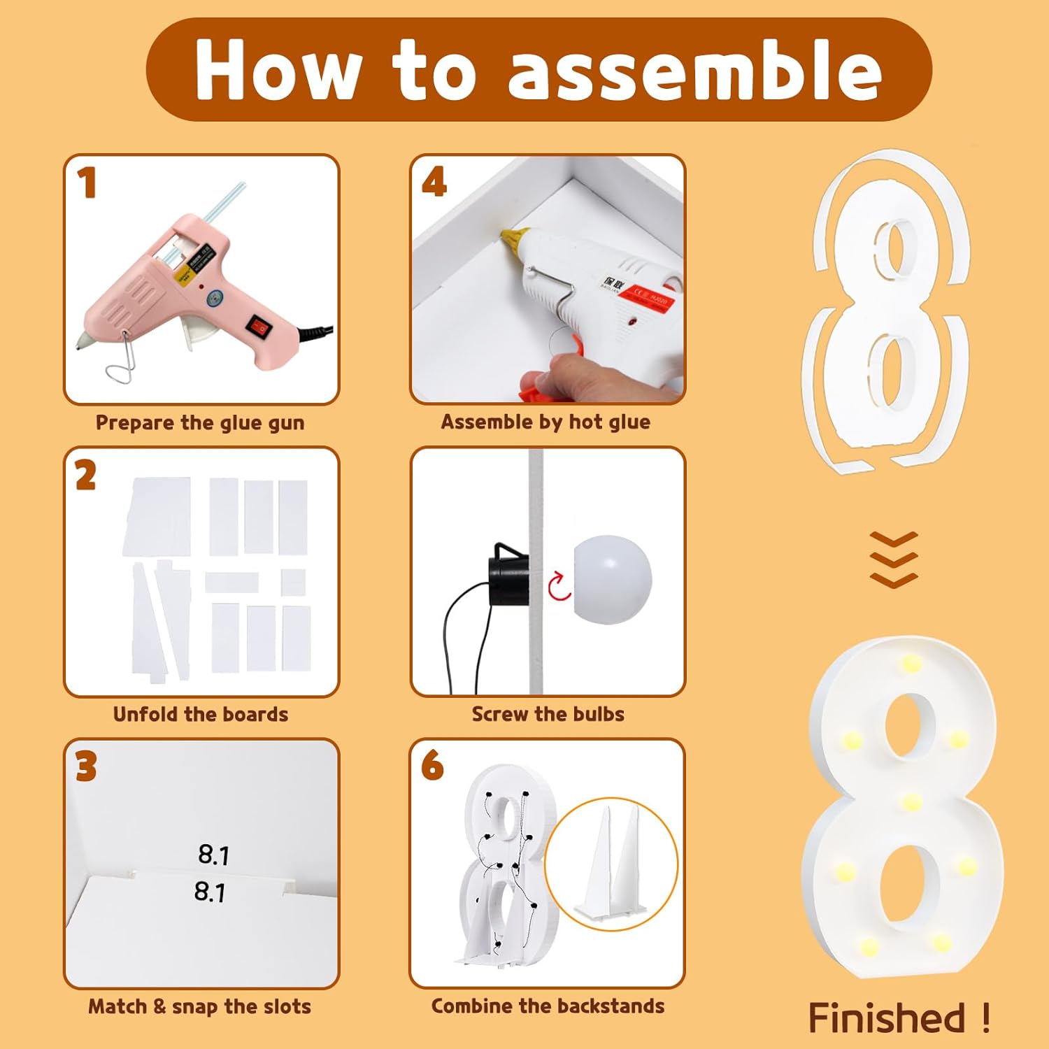 - Package Includes: A set of light up numbers for party containing the pre-cut letter frames, a light string with several bulbs and assemble guiding manual. ( Noted: Glue gun and batteries are not included