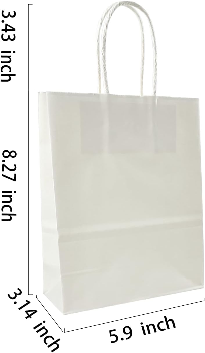 BAG BOX 100 Pack 5.9x3.1x8.25 Inch White Gift Bags with Handles,Bulk Kraft Paper Bags for Shopping, Retail, Merchandise, Wedding, Party Favors, Paper Grocery Sacks