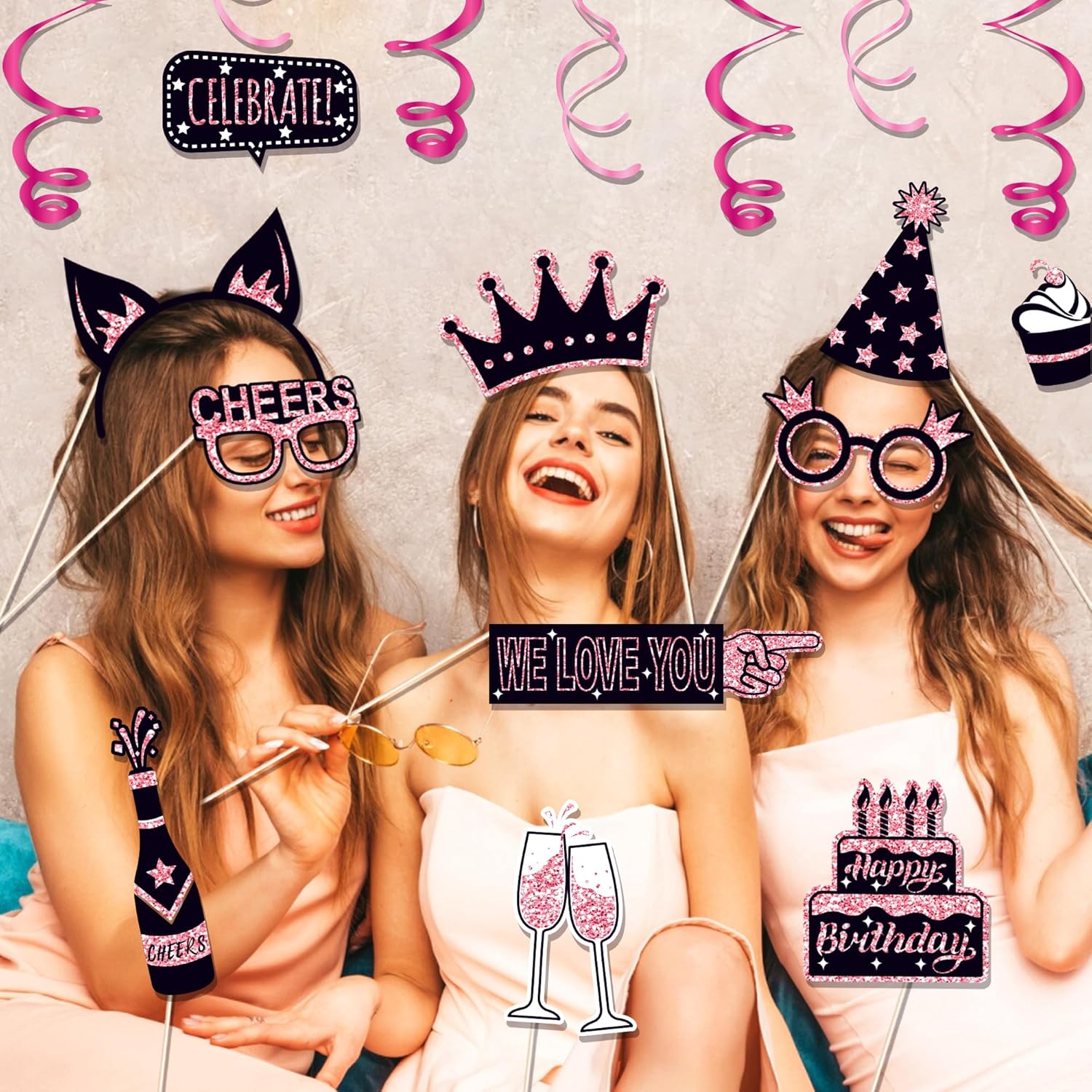 36 PCS Birthday Photo Booth Props Party Supplies Holiday Picture Decorations Photo Booth Props for Birthday Party Favors Pose Sign Kit Fun for Party (Black and Pink)