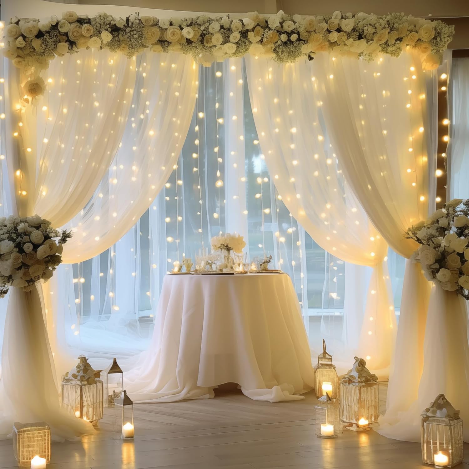 20×10ft Cream White Tulle Backdrop Curtain with Lights String for Parites, Sheer Curtain Backdrop Drapes for Wedding Party Home Decorations