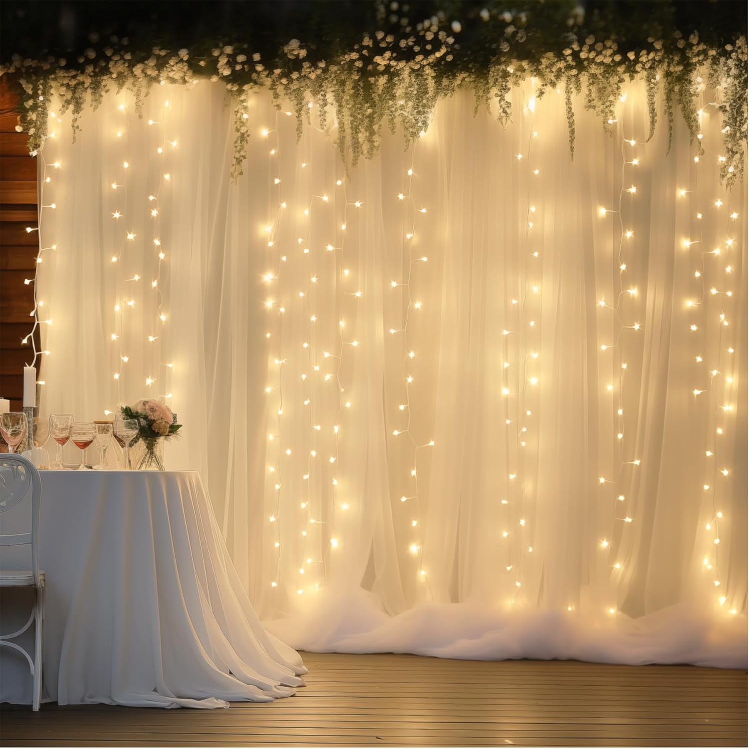 - Size: Package including 6 panels 5ft width by 10ft height ivory backdrop curtains with lights, a set of 9.8ft warm white lights and 12pcs Transparent clips. High quality ivory tulle fabric, collapsible without creases, Beautiful Sheer Drapes! Can be reused. If you want a thicker/fuller look, you would need more