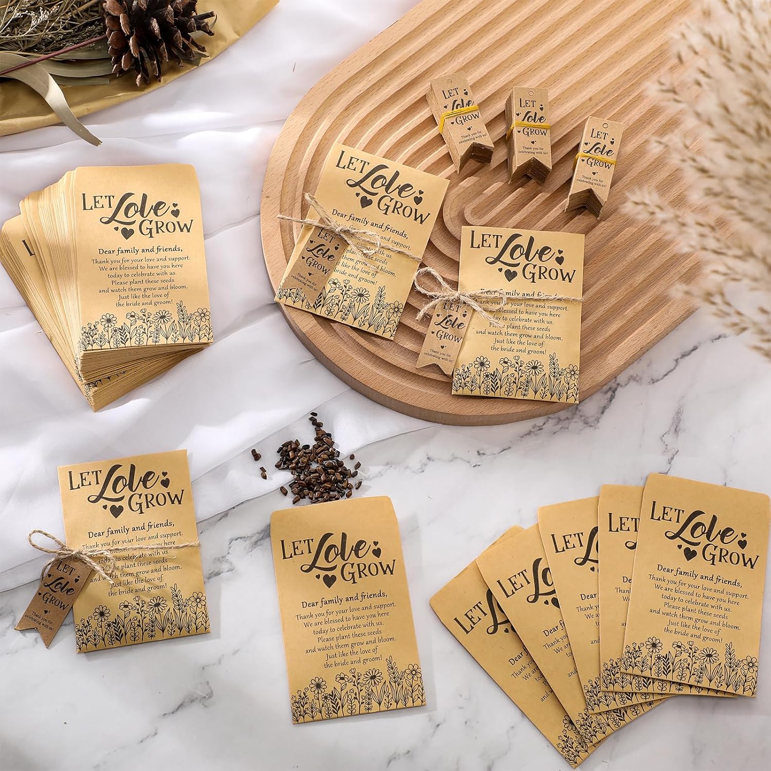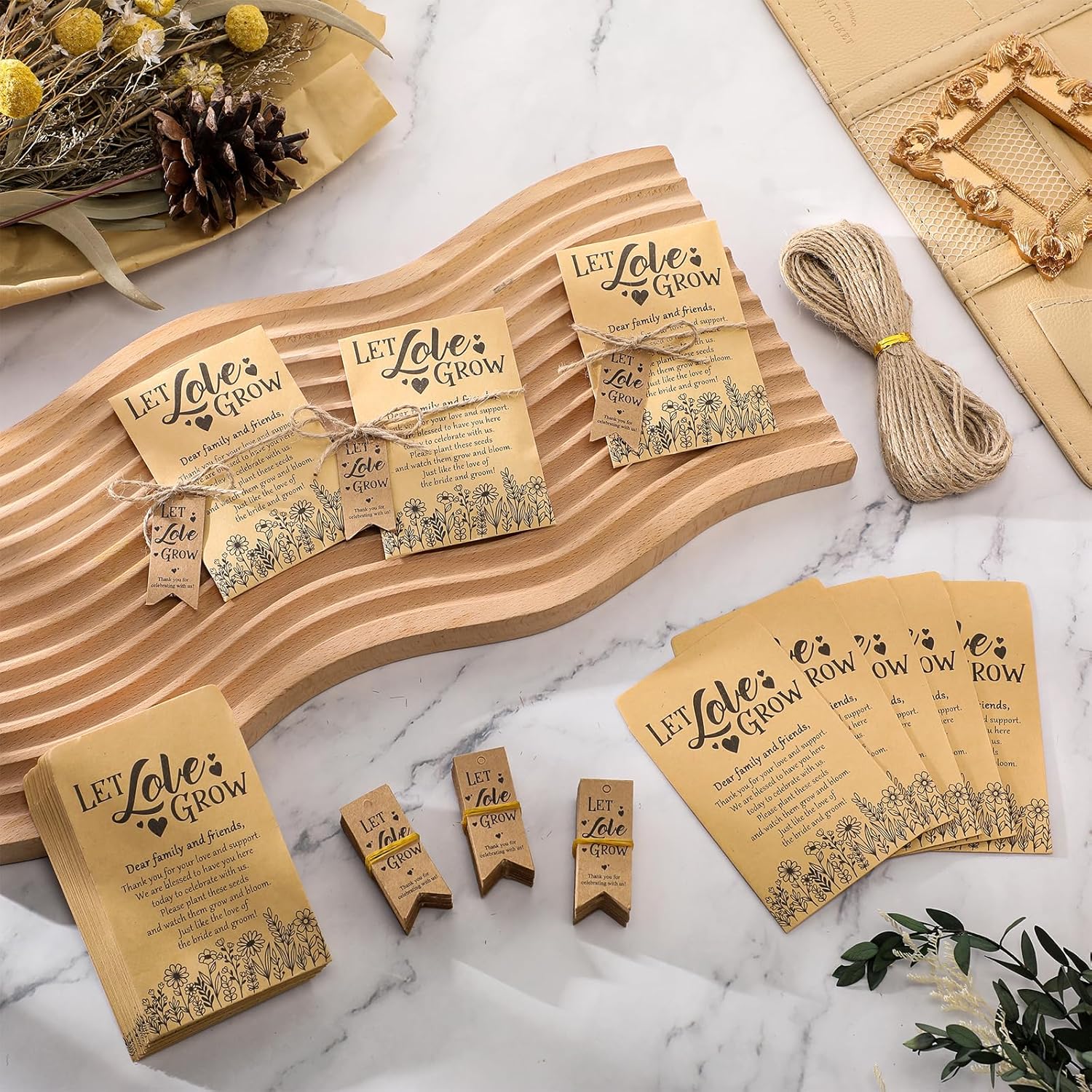 - Ideal Wedding Keepsake: experience the elegant touch of giving out 50 [Let Love Grow ] packets, 50 tags and 2 bundles of hemp ropes as wedding favors; This set immediately differentiates your wedding and gives your guests a memorable keepsake that symbolizes your important day
