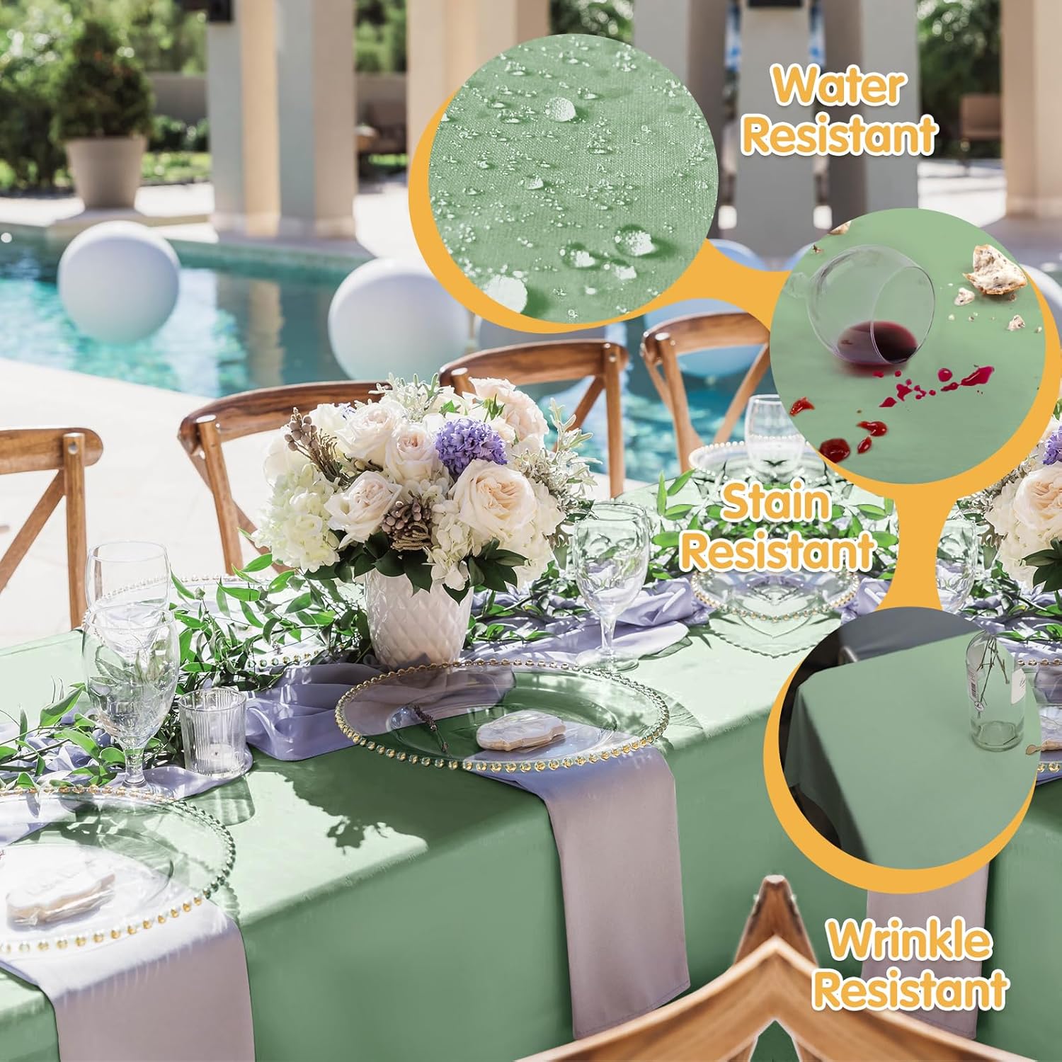 - Stain & Wrinkle Resistant: No worry about juice, red wine, sauce, gravy or other food being spilled on your table cloth, any spots come out easily