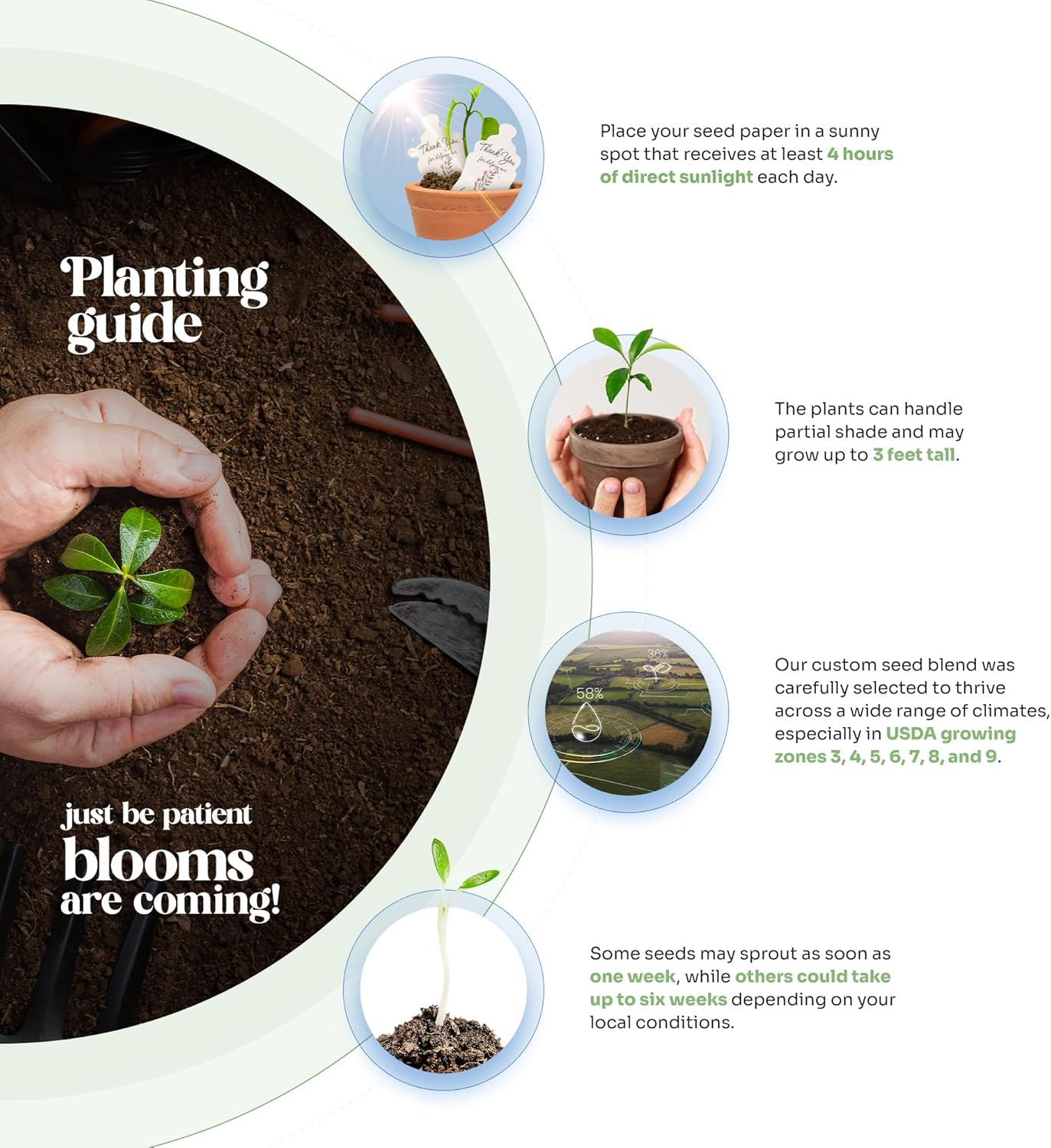 - For best results, place your seed paper in a sunny spot that receives at least 4 hours of direct sunlight each day. The plants can handle partial shade and may grow up to 3 feet tall. Our custom seed blend was carefully selected to thrive across a wide range of climates, especially in USDA growing zones 3, 4, 5, 6, 7, 8, and 9. Some seeds may sprout as soon as one week, while others could take up to six weeks depending on your local conditions. Just be patient — blooms are coming!