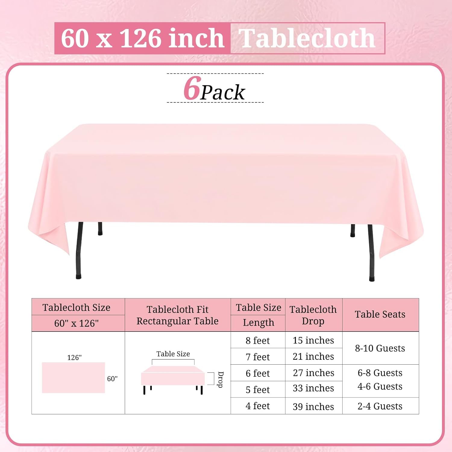 - 【Perfect size】: This pink table cloth is 60 inch wide and 126 inch long, cut entirely from a single piece of fabric, perfect for standard 8ft table, providing 15 inch drop. Pink tablecover is more luxurious, classic and gracious, ideal for both formal & casual settings and makes a great gift for all occasions.Upgrade your special moment and daily life with an exquisite taste.