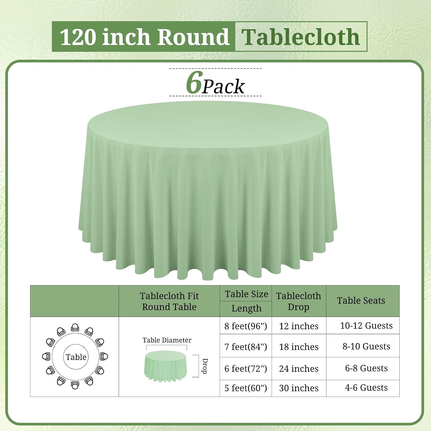 6 Pack Sage Green Round Tablecloths - 120 Inch, Polyester Table Cover, Stain and Wrinkle Resistant Washable Fabric Table Cloth for Wedding Banquet Parties