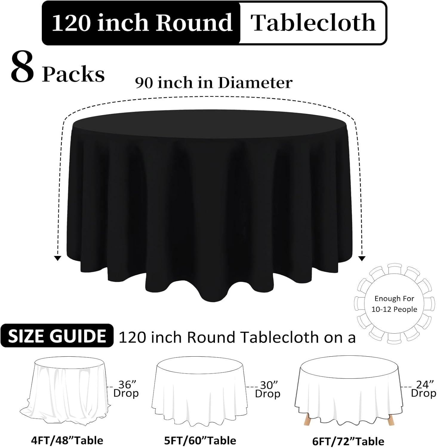 - Measurements and Colors: This black cloth tablecloths is 120 inches in diameter, suit for standard 8FT(96") round tables, providing a 12" drop, or 24" if your round table is 6FT (72"). This table cloth round cover is available in totally 5 colors. Youβll be able to choose a luxurious and ideal table cover for your table. Please measure the size of your table before purchasing.