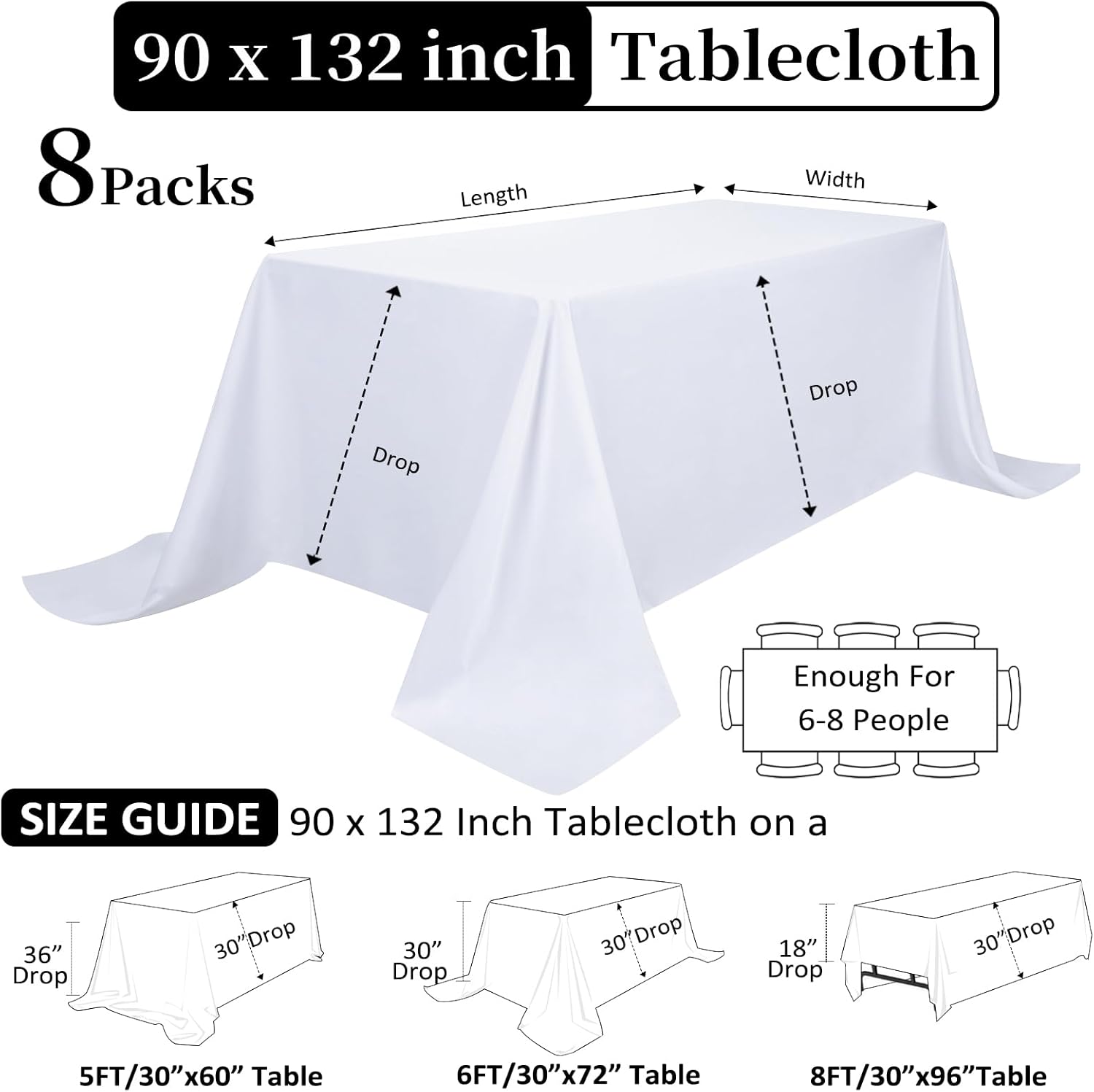 8 Pack White Table Cloth 90 x 132 Inch Rectangular Tablecloths for 6 Foot Rectangle Tables, Wrinkle Resistant White Tablecloth Washable Polyester Fabric Table Covers for Party Wedding Banquet
