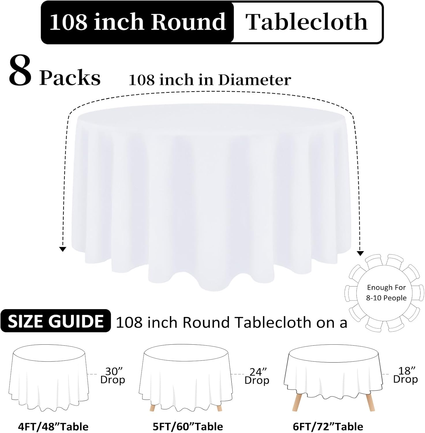 - Measurements and Colors: This white cloth tablecloths is 108 inches in diameter, perfect for standard 6FT(72") round tables, providing a 18" drop, or 24" if your round table is 5FT (60"). This table cloth round cover is available in totally 5 colors. Youβll be able to choose a luxurious and ideal table cover for your table. Please measure the size of your table before purchasing.