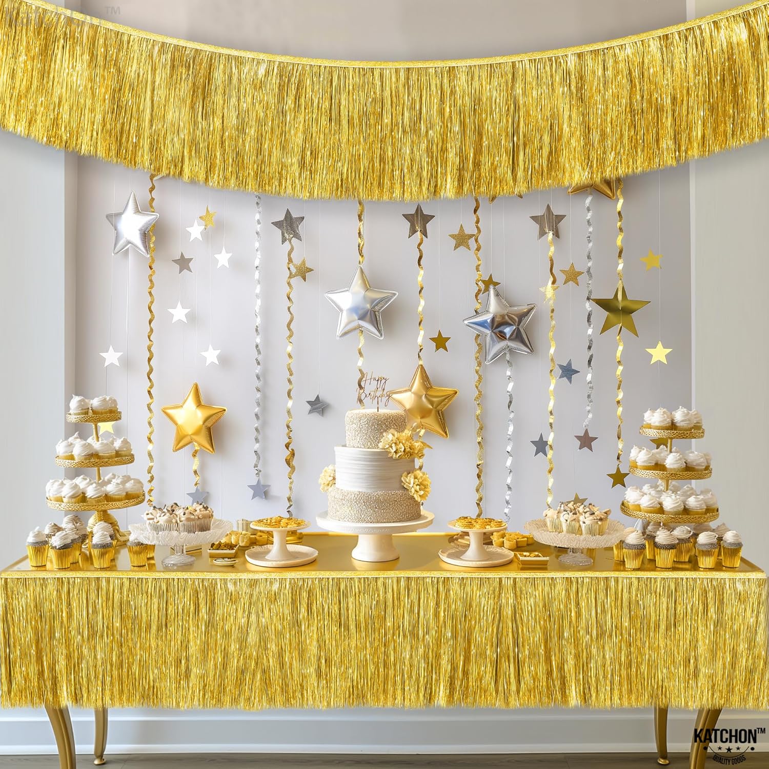 KatchOn, Pack of 2 Gold Fringe Garland - Gold Tinsel Banner for Birthday Party Decorations, Bridal Shower | Golden Foil Curtains for Golden Party Decor, Wedding, New Years Decorations