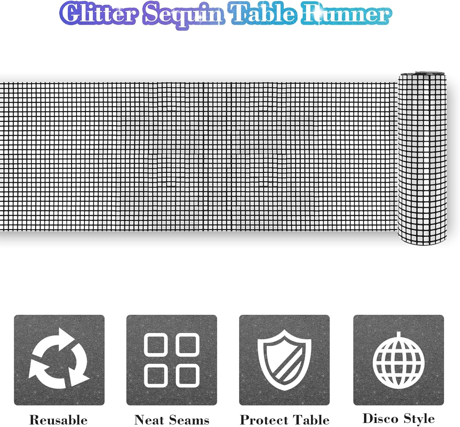- BLACK AND SILVER TABLE RUNNER: Our table runners are designed with silver sequins and black polyester. The mirrored squares on the tablecloths are meticulously crafted, fine workmanship, durable, waterproof, oil and stain resistant