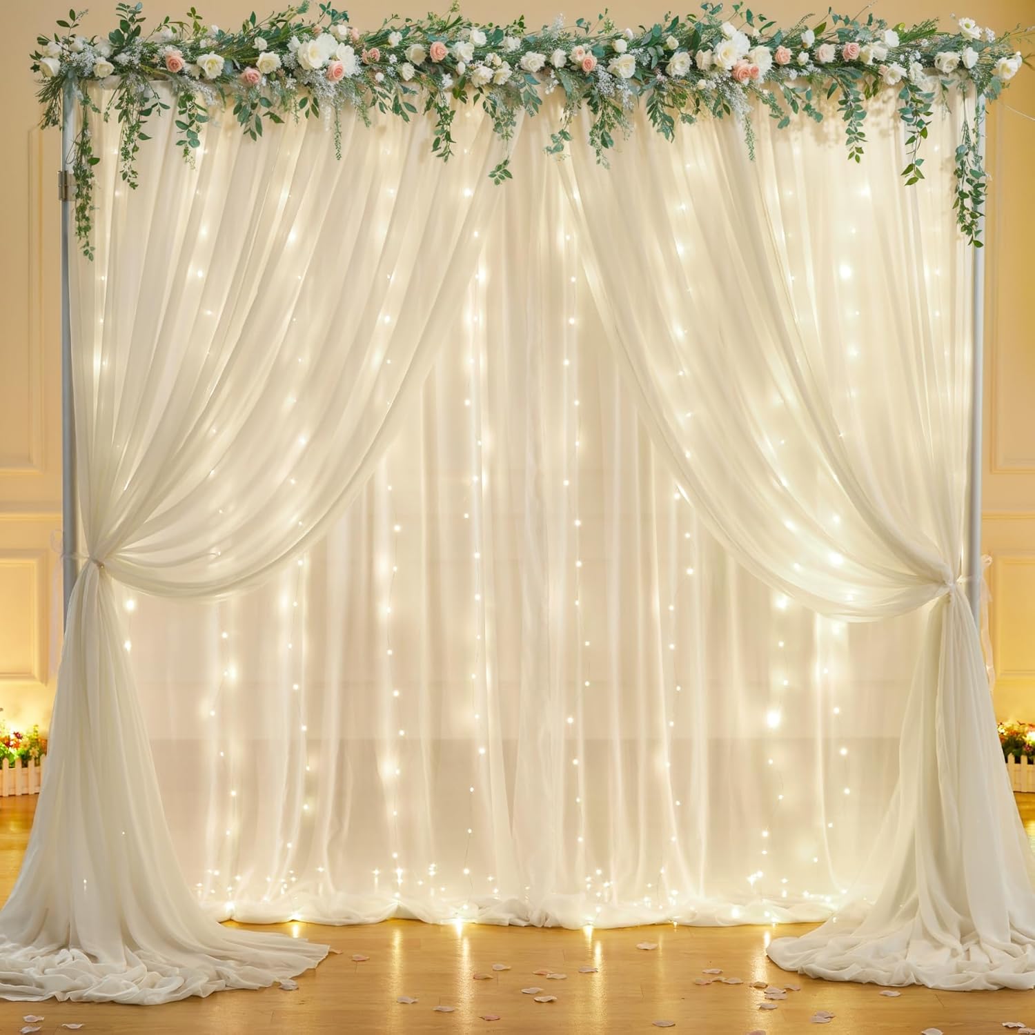 - Material: The ivory backdrop curtains with lights are made of premium chiffon fabric, drapes beautifully and elegantly, creating a more warm, romantic, cheerful, and relaxed atmosphere. More sturdy than tulle fabric backdrop, easy to care