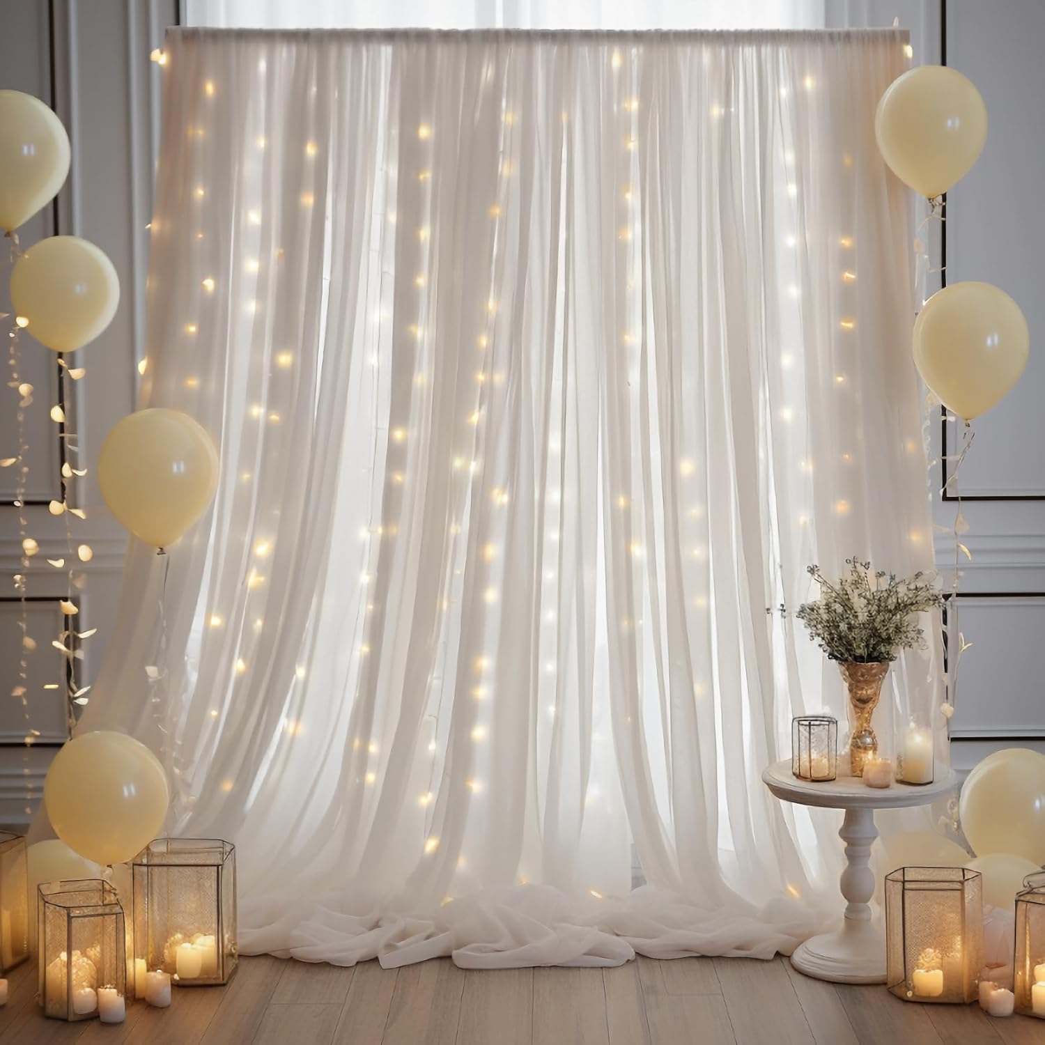 - Material: The cream white curtain backdrop with lights are made of premium chiffon fabric, drapes beautifully and elegantly, creating a more warm, romantic, cheerful, and relaxed atmosphere. More sturdy than tulle fabric backdrop, easy to care