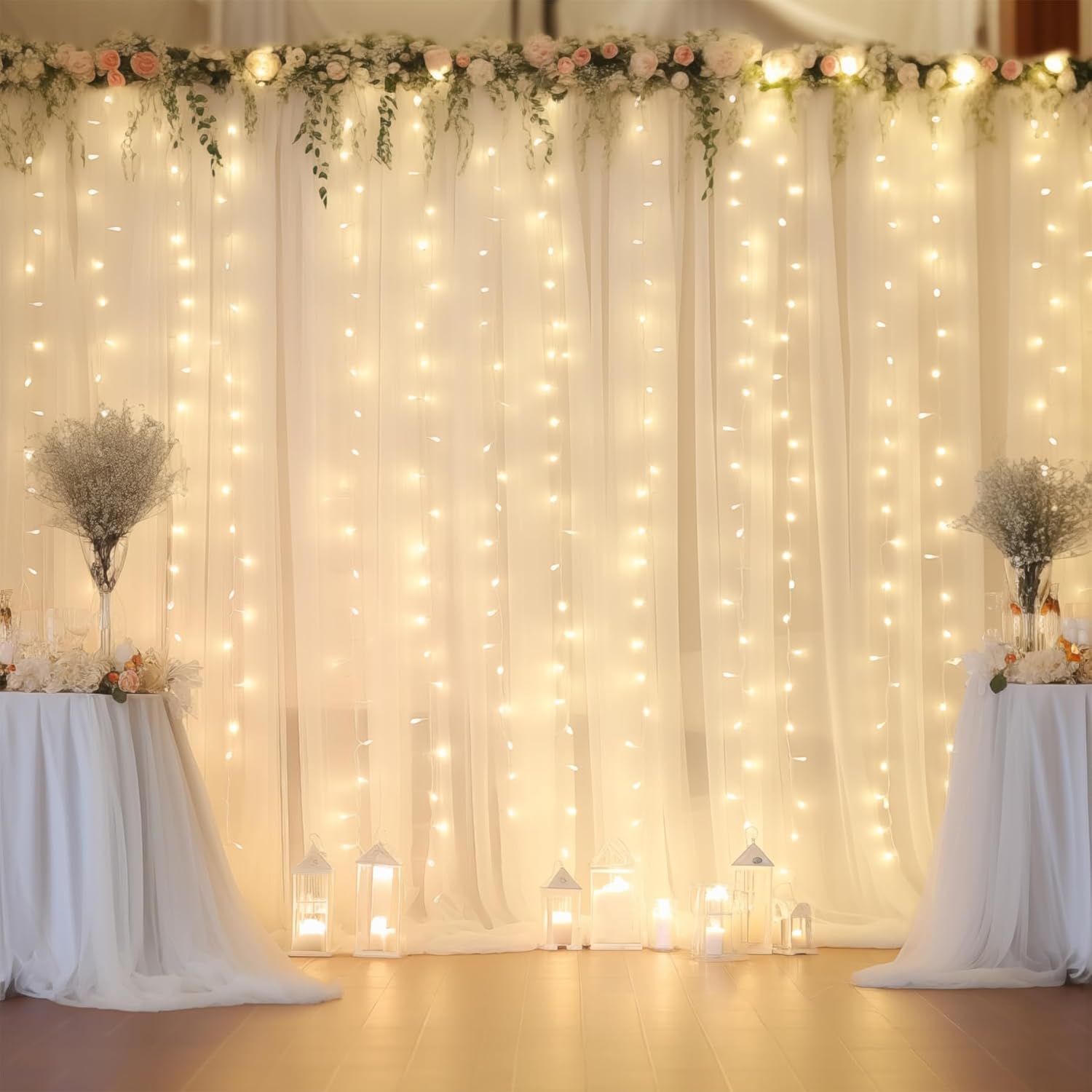 - Features: Cream curtains with lights included for a classy yet enchanting atmosphere, can be worked with your wedding backdrop or party backdrop, but also for ceremonies, festivals, anniversaries,or home decoration. INSTALLATION TIPS: firstly, untie and secure the main strand. and then, untie each string light.