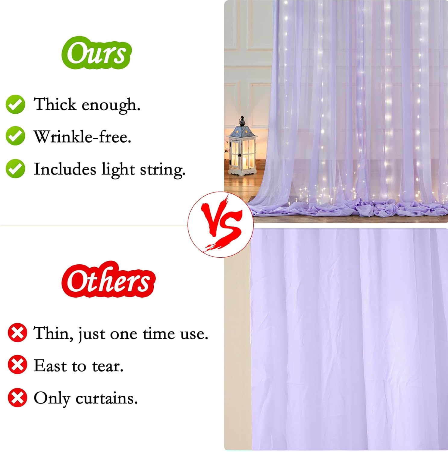 - Material: The light purple curtain backdrop with lights are made of premium chiffon fabric, drapes beautifully and elegantly, creating a more warm, romantic, cheerful, and relaxed atmosphere. More sturdy than tulle fabric backdrop, easy to care