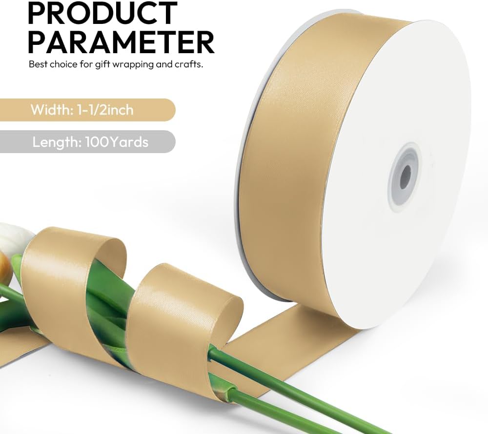 - 【High Quality】: Our fabric satin ribbon is made of 100% high-quality polyester. The single face ribbon for gift wrapping is Light Gold color and has smooth texture which is easy to cut and use.