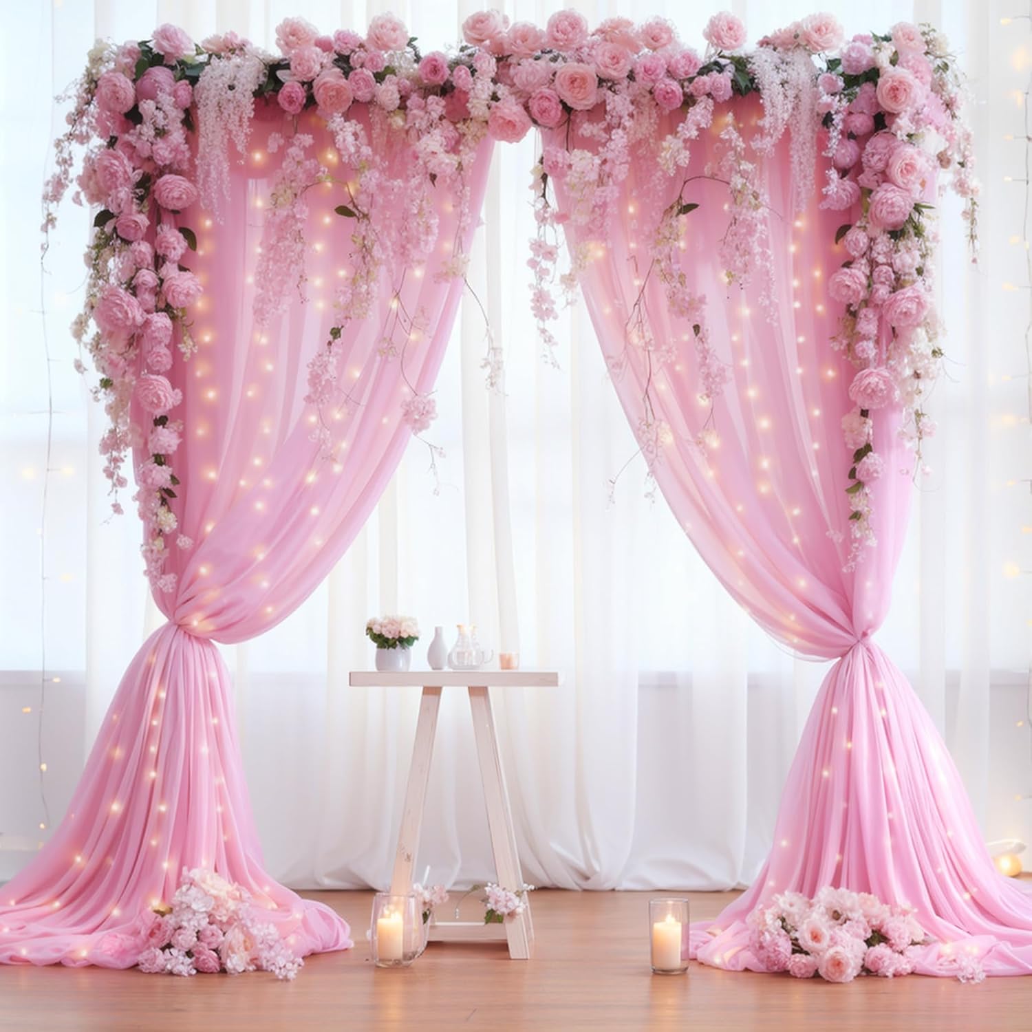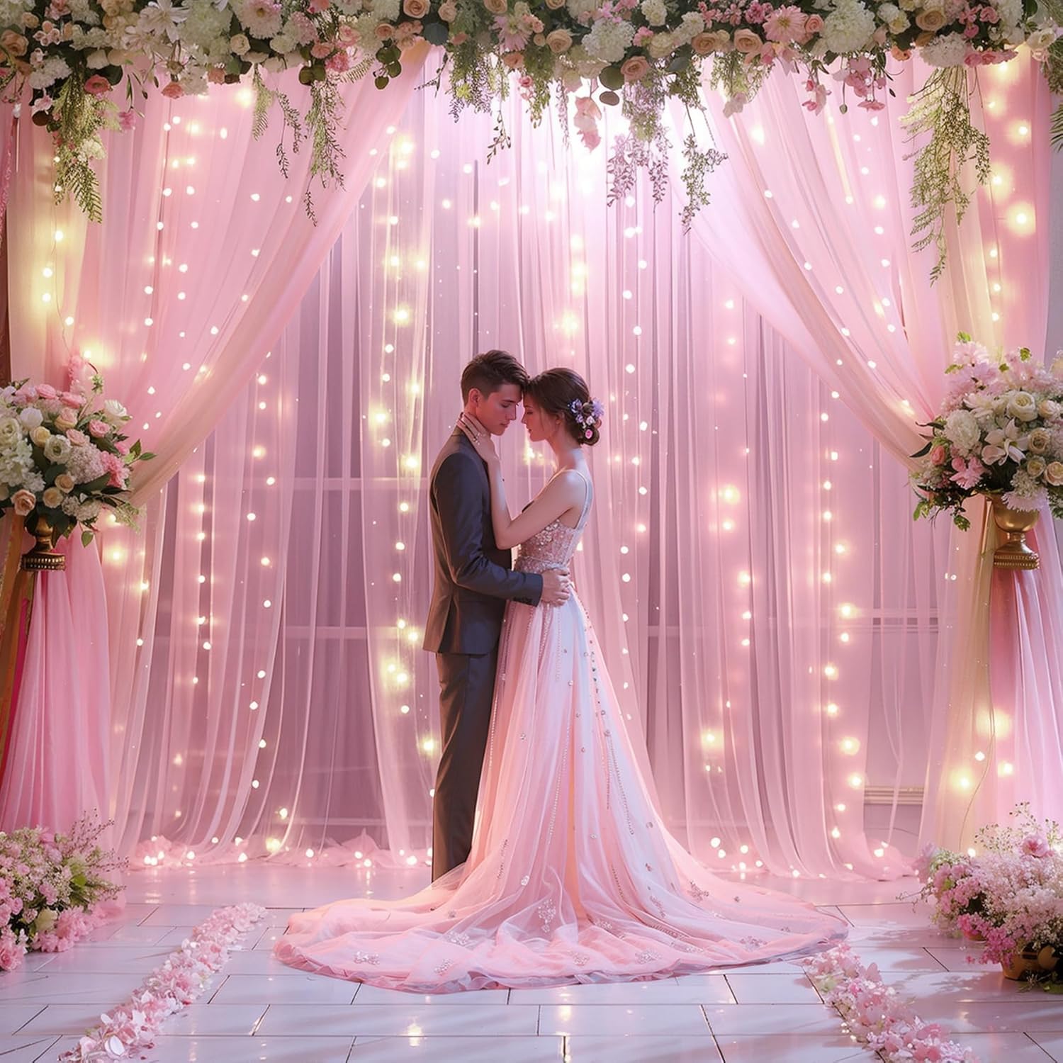 - 【Stunning Wedding Photo Backdrop】 Create a breathtaking ambiance with 10ft x 10ft semi-sheer chiffon backdrop curtain set. Includes 2 panels of 5ft(W) x 10ft(H) pink backdrop curtains, a 9.8ft warm white light string, and 12 transparent clips. Using it as a sweet party or wedding reception backdrop curtain, surrounded with balloons or flowers. It will be a hit among your guests and made for stunning photos.