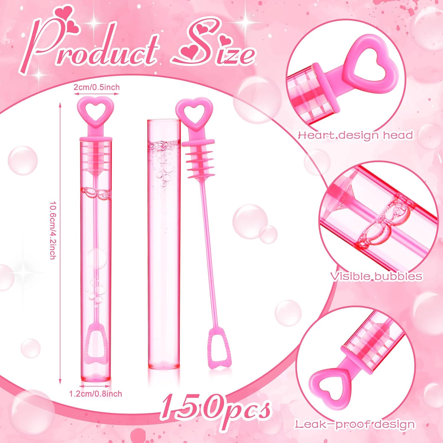 • Romantic Heart Design: our bubble tubes feature a charming heart top design; Further sealed with a rubber stopper, these bubble tubes demonstrate a thoughtfulness that ensures the bubble solution does not leak during transportation and your guests' experience is pleasant