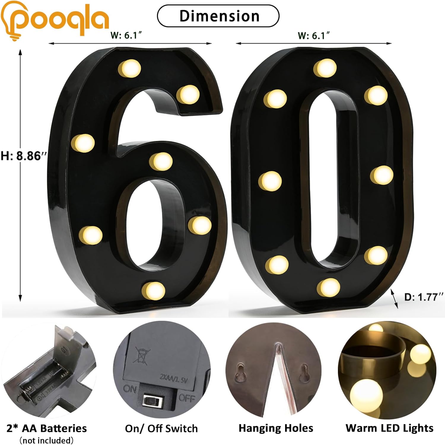 Pooqla Decorative Led Light Up Number Letters, Black Plastic Marquee Number Lights Sign for 60th Birthday Party Wedding Decor Battery Operated Black Decoration 60