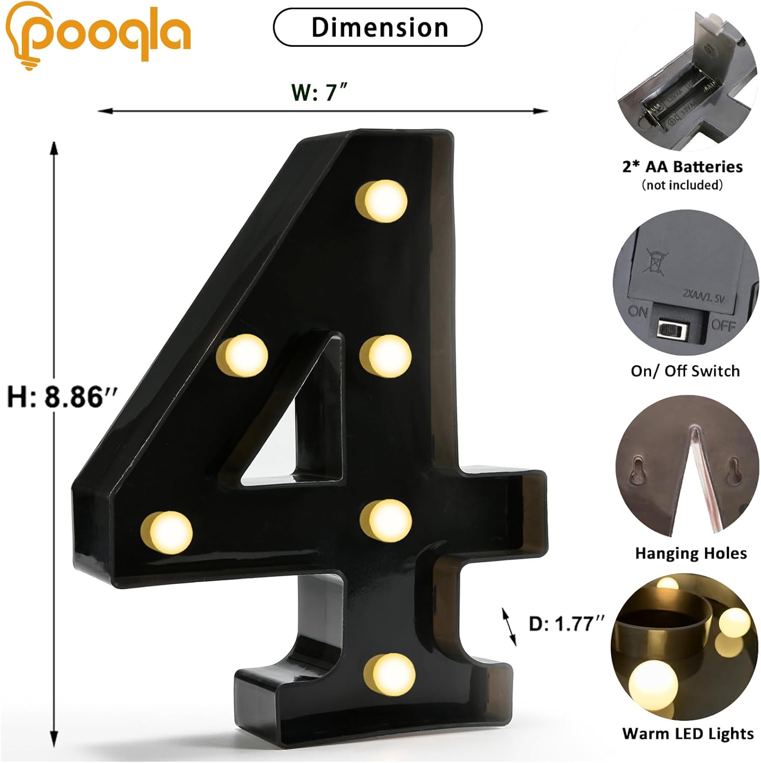 Pooqla Light Up Numbers, Lighted Marquee Number Sign for 4th Birthday Party Decor, Battery Powered LED Number Lights for Party Decor, Lights Sign for Wall Home Anniversary, Decoration 4