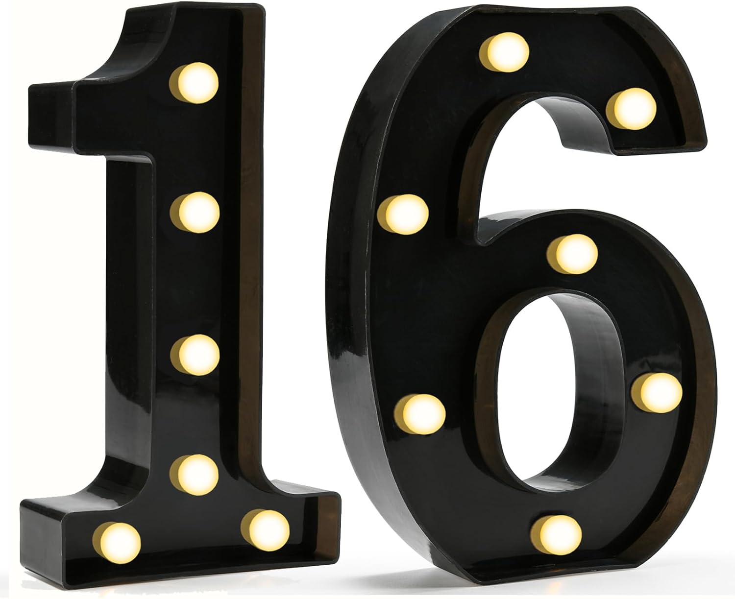Pooqla Decorative Led Light Up Number Letters, Black Plastic Marquee Number Lights Sign for 16th Birthday Party Wedding Decor Battery Operated Black Decoration 16