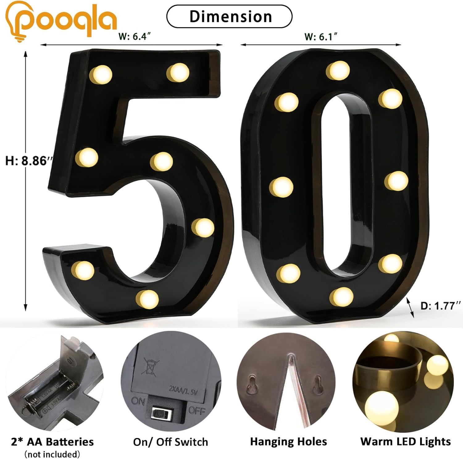 Pooqla Decorative Led Light Up Number Letters, Black Plastic Marquee Number Lights Sign for 50th Birthday Party Wedding Decor Battery Operated Black Decoration 50