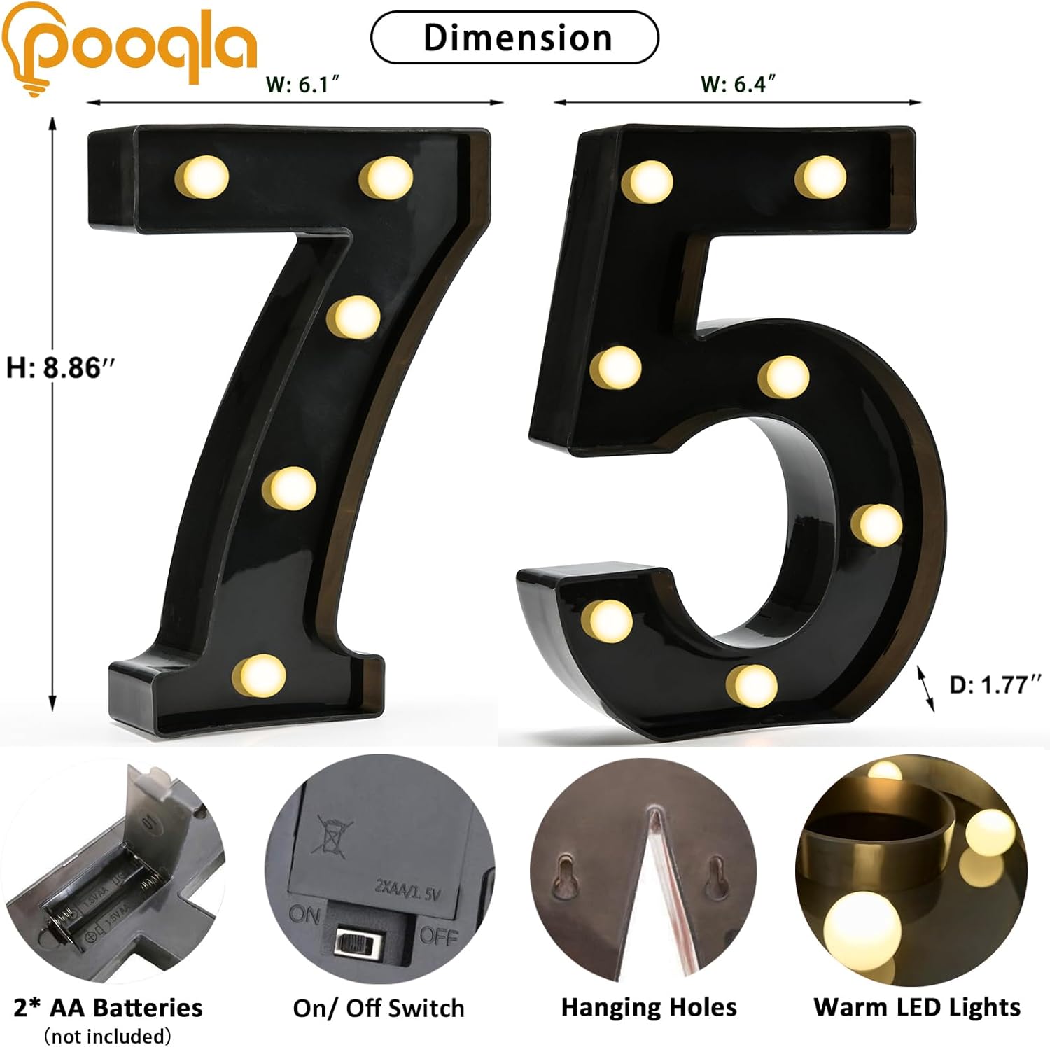 Pooqla Decorative Led Light Up Number Letters, Black Plastic Marquee Number Lights Sign for 75th Birthday Party Wedding Decor Battery Operated Black Decoration 75