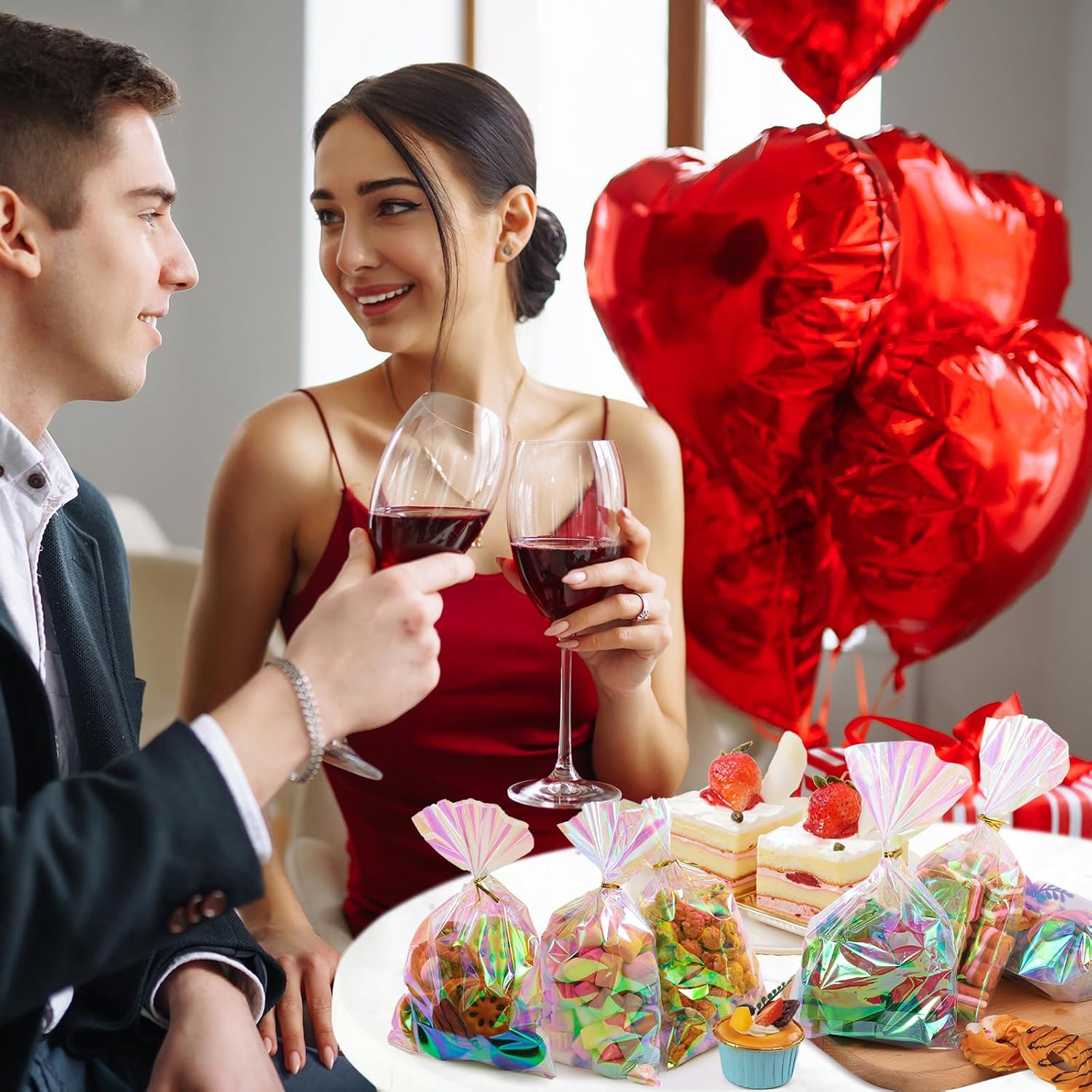SUREHOME Cellophane Bags, 100 Pcs 6x10 Inches Clear Treat Bags with Ties Plastic Gift Bag Holographic Iridescent Pink Goodie Bag for Party Favors Wedding Candy Valentine Snack Popcorn Cookies Packing