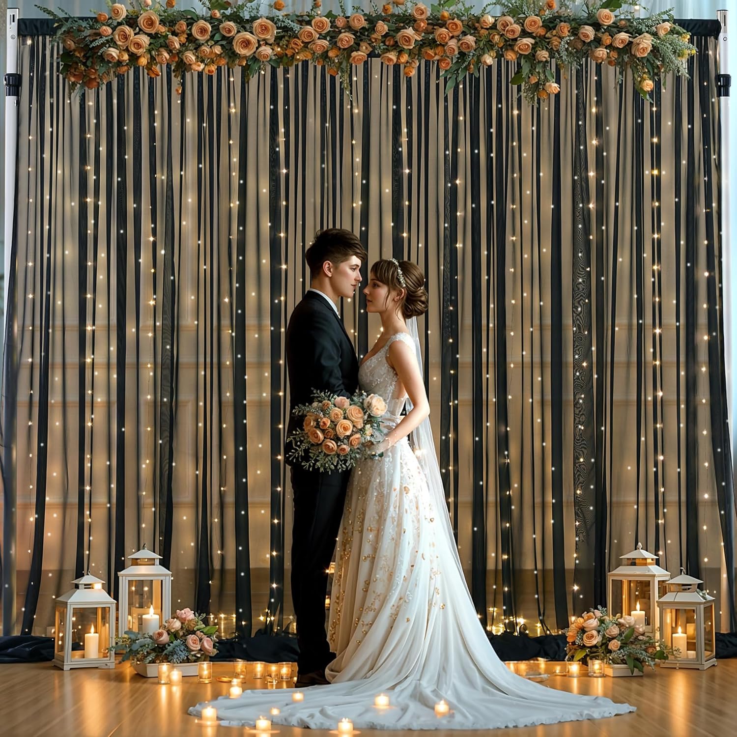 - 【Stunning Photo Backdrop】10ft x 10ft semi-sheer chiffon backdrop curtain includes: 2 panels of 5ft(W)x10FT(H) black backdrop curtains, a 9.8ft warm white light string, and 12 transparent clips. Using it as a sweet party or wedding reception backdrop curtain, surrounded with balloons or flowers. It will be a hit among your guests and made for stunning photos.