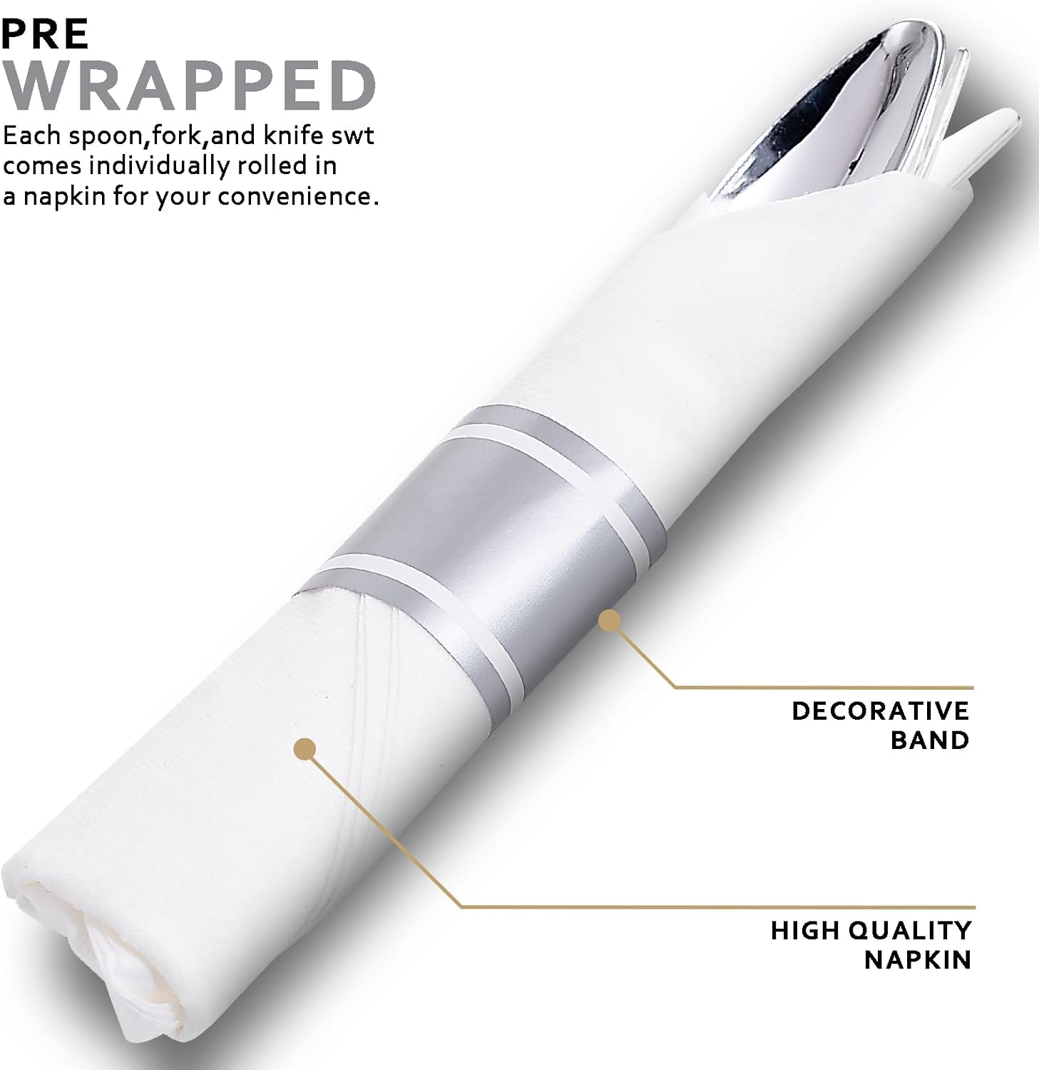 - Pre-rolled Convenience: As the perfect pre wrapped silverware set disposable, you don't even have to worry about buying napkins. Our pre rolled silverware disposable, paired with these pre-rolled napkins, makes your event a breeze.