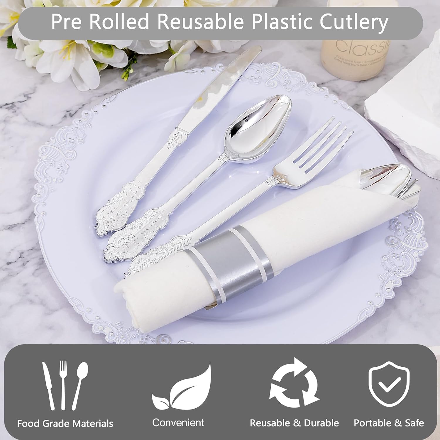 - Elegant and Convenient: The silver plastic cutlery feel smooth and shiny, maintaining the standard of luxury you want. The rolled silverware disposable are very clear and convenient for you dinners. You can throw them away afterwards without having to wash them.