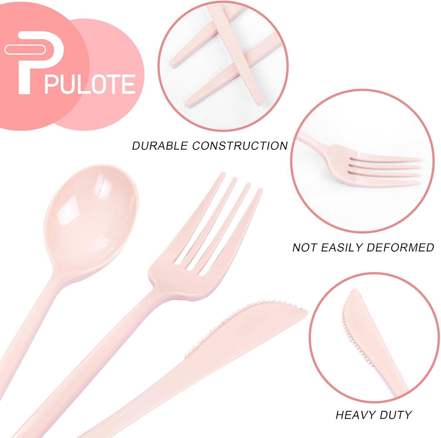 PULOTE 150PCS Pink Plastic Silverware - Plastic Cutlery Heavy Duty - Pink Utensils Set Disposable Include 50 Forks, 50 Spoons, 50 Knives for Wedding, Party & Mother’s Day