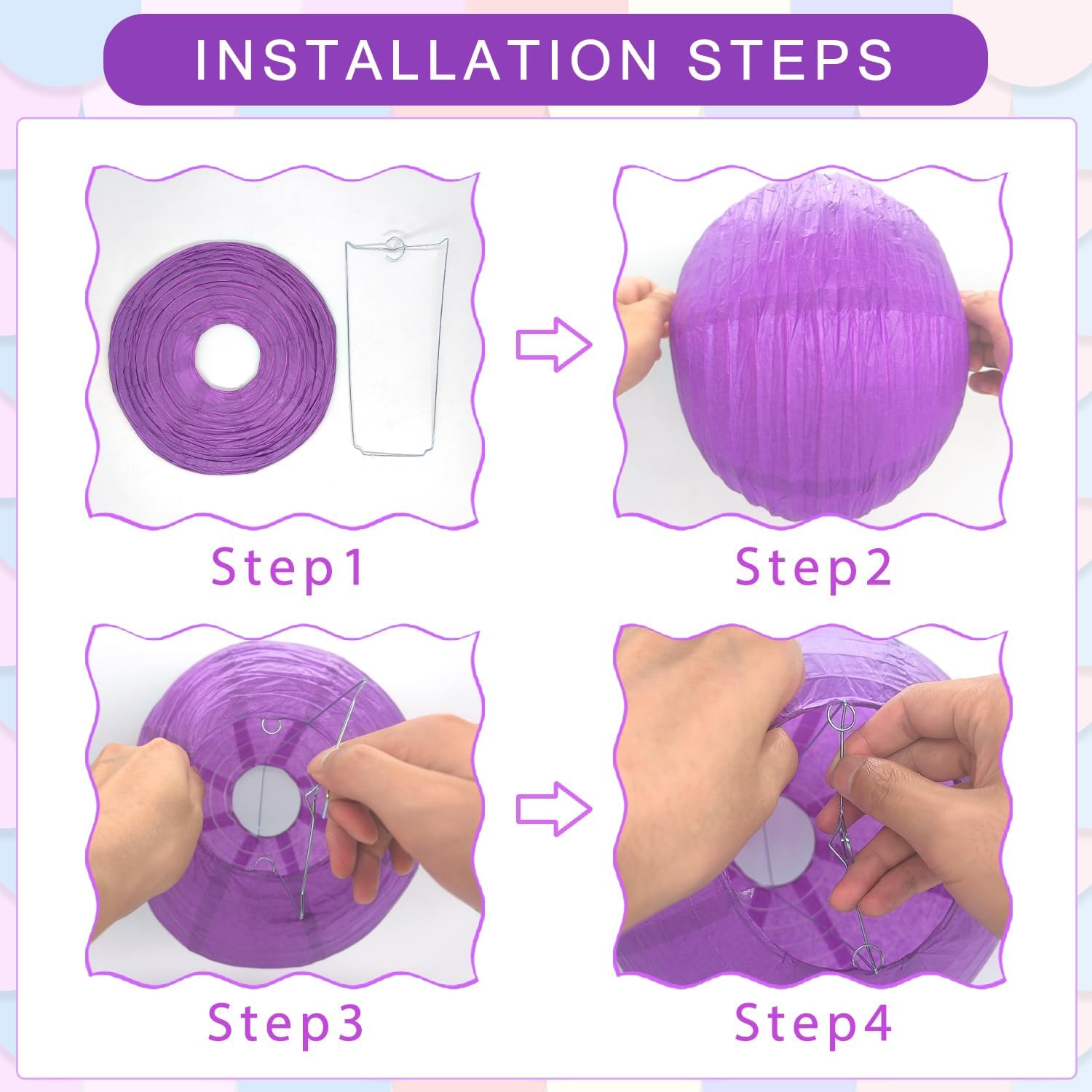 - 【Easy to assemble】: Our lanterns are easy to unfold, assemble and hang up, and they can be folded flat for storage. All you need to do is to pull the two ends gently to open the lantern and insert the metal frame (included in the pack) into the lantern to keep its shape.