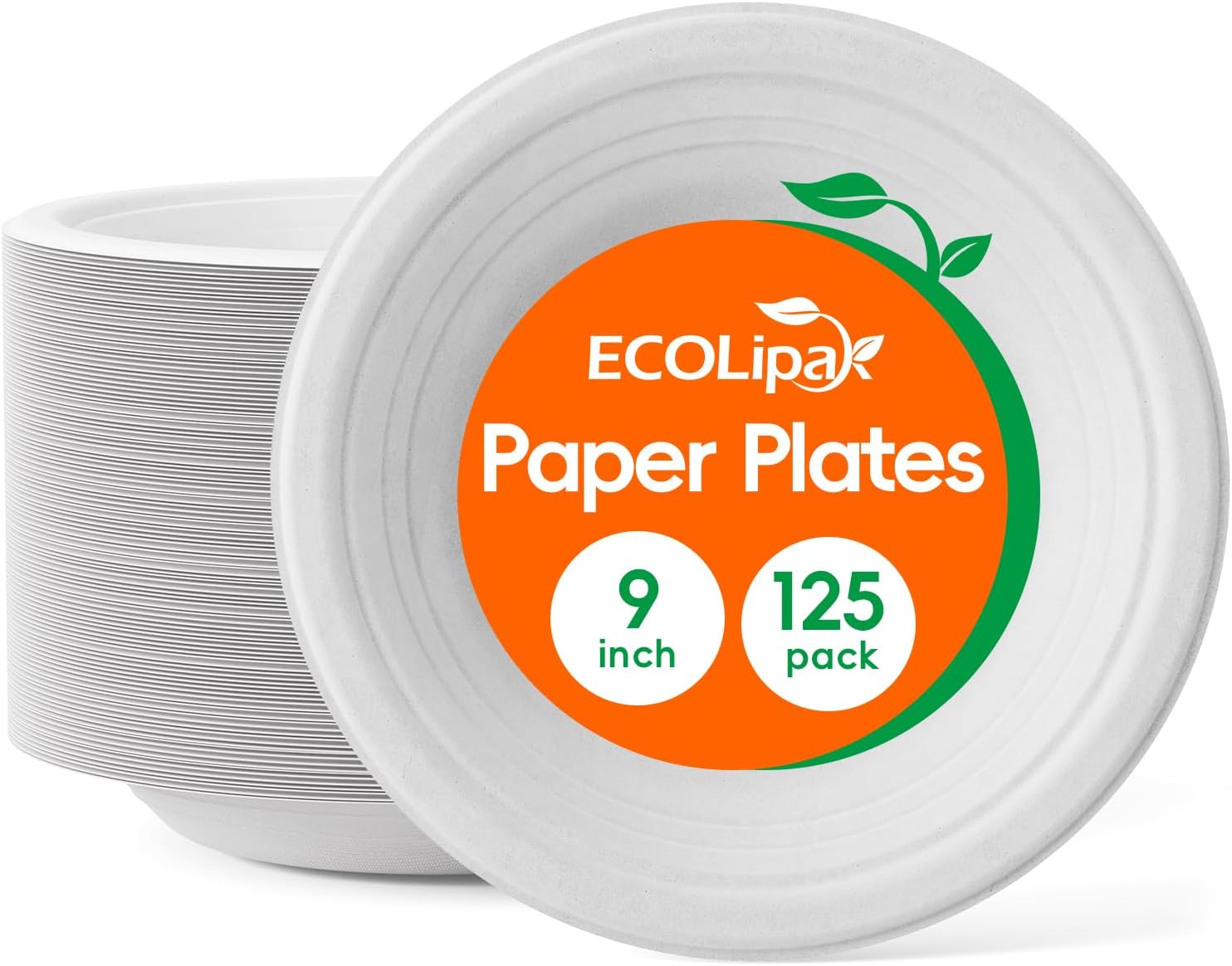 ECOLipak 125 Pack Paper Plates 9 inch 100% Compostable Heavy-Duty Dinner Plates Disposable Bagasse Deep Dish Natural Biodegradable Eco-Friendly Sugarcane(White)