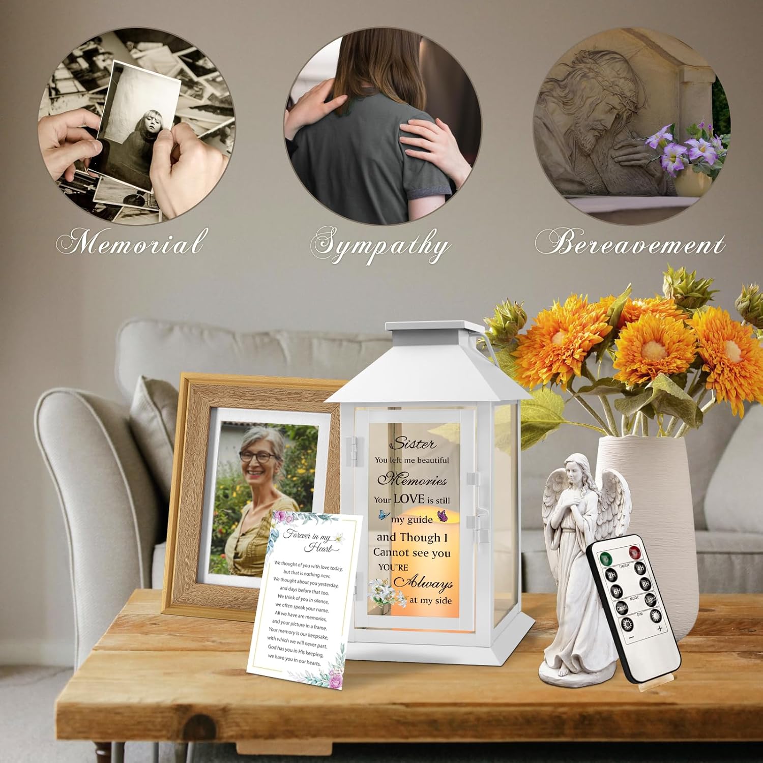 - Meaningful Gift: A unique way to treasure loved ones no longer with us. An attached handle on the top of this memorial lantern allows you to hang it or use it freestanding. The perfect sympathy gift for loss of sister.If you have any questions, please feel free to contact us and we will offer you a satisfactory solution in 24 hours.