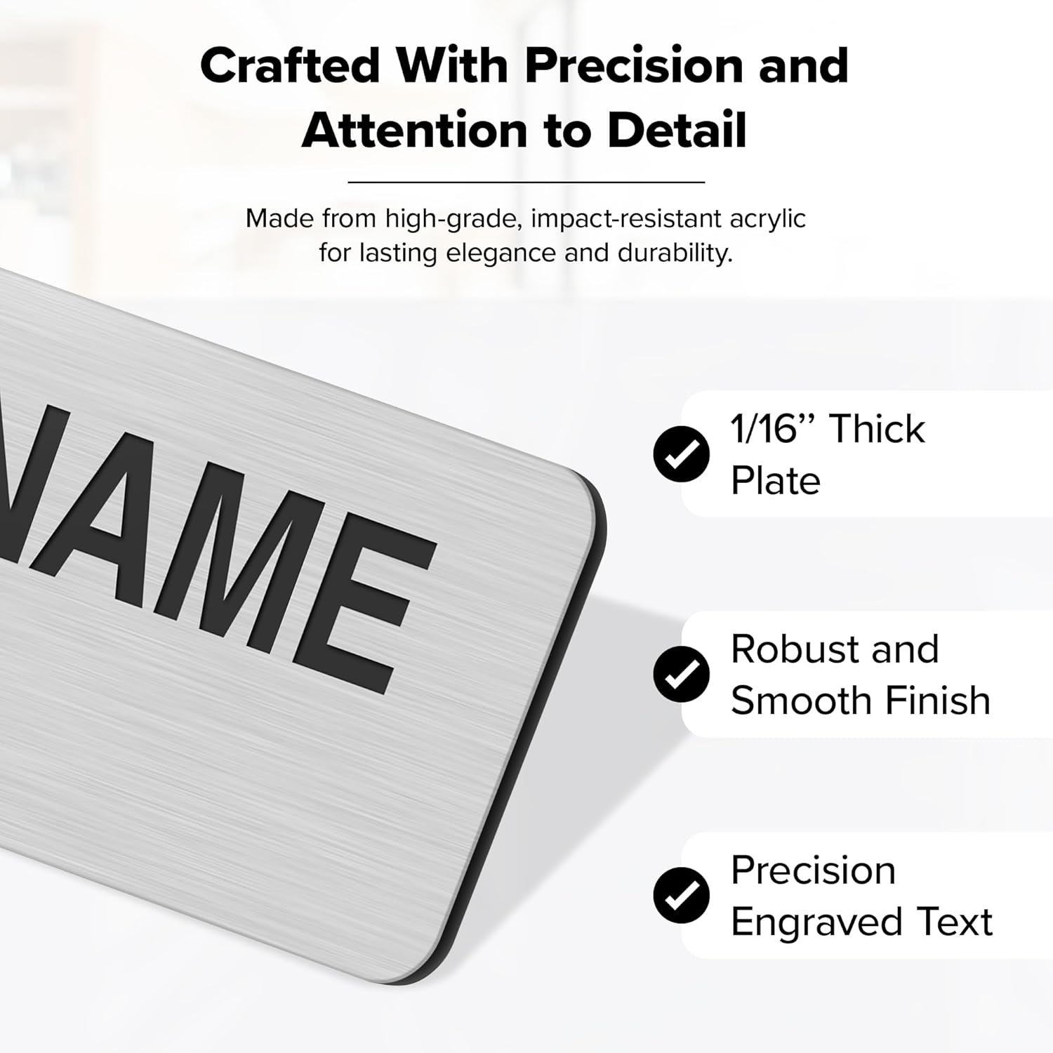 - Quality You Can Trust: Our name plates are crafted with high-grade, impact-resistant acrylic that provides exceptional strength and resistance to any conditions without losing its elegance and shine!