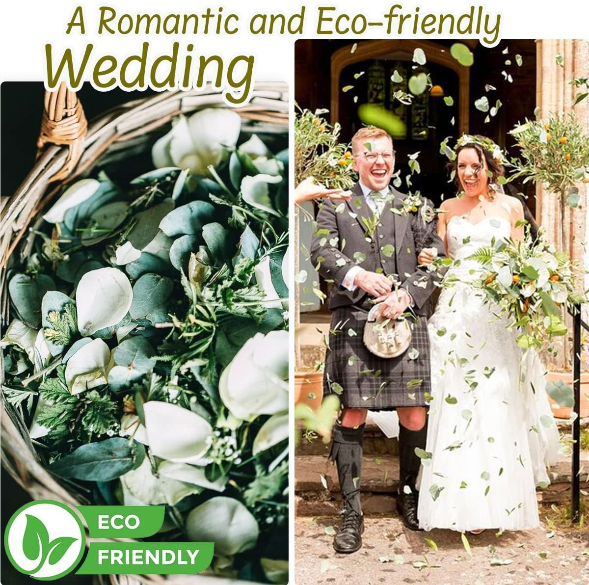 - Pure Natural Leaves: The wedding party confetti is made of eucalyptus leaves pure natural, real leaves petals and easy clear. When you sprinkle it in the air, it will form a beautiful rain of leaves, feel romantic and let yourself be in nature at the same time. You don't have to worry about polluting the environment. It is taken from nature and Merged with Nature after a period of decomposition