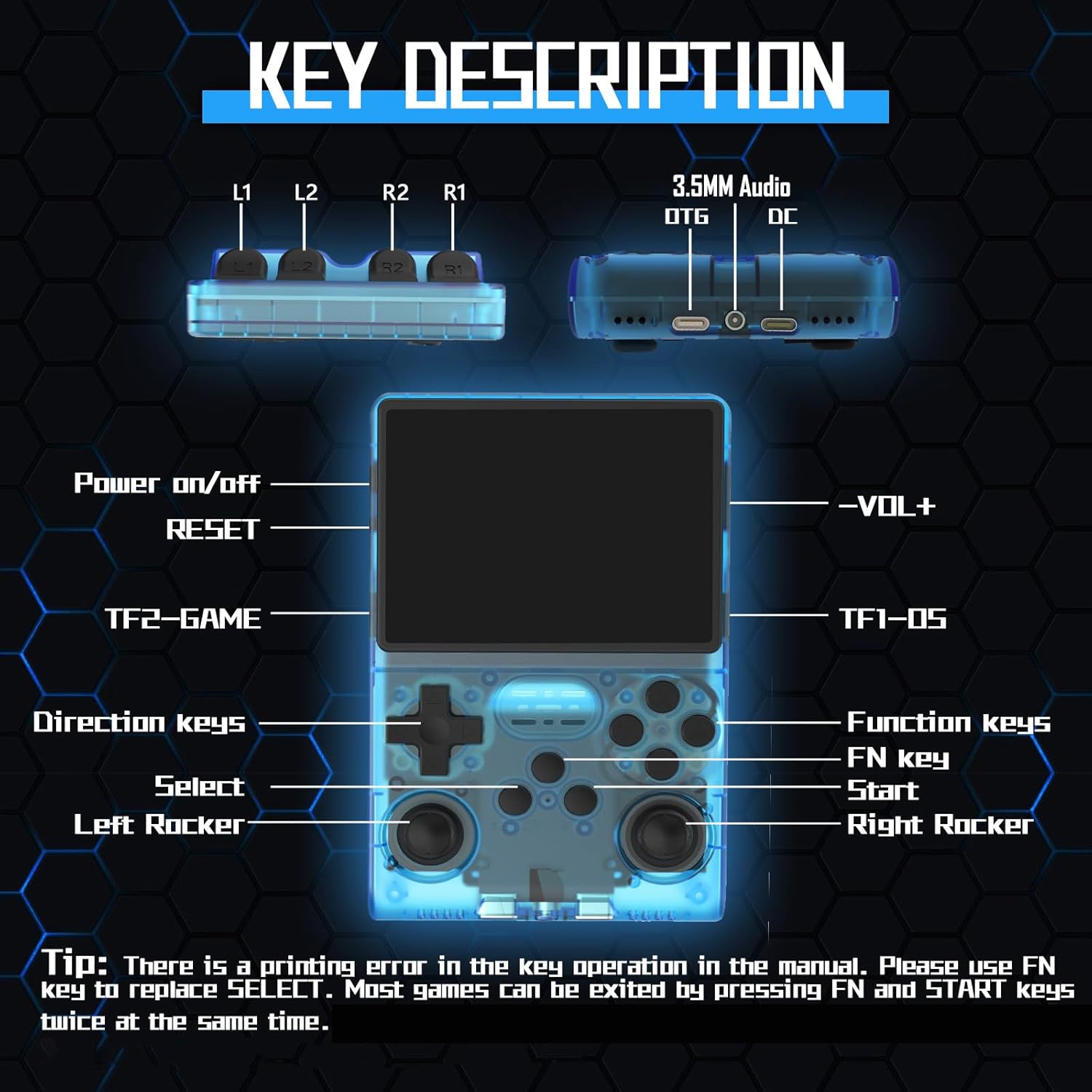 - 【R40S PRO new system】 1.5GHz 64-bit RK3326 CPU, Mali-G31MP dual-core GPU,4GB*2 RAM DDR3L; the new operating system provides a more responsive and smoother experience. Pre-installed with 30,000+ games, it supports 12+ mainstream simulators, and the 256GB extended memory allows for adding more games.Save is FN+R1, and loading is FN+L1.
