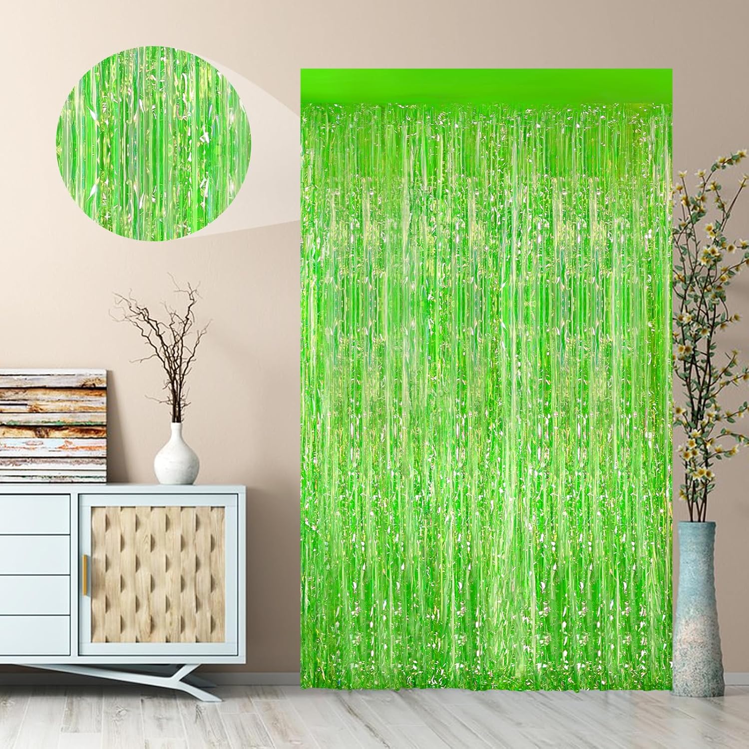 2Pack 3.3 x 8.3Ft Neon Green Foil Fringe Backdrop Curtains, Green Tinsel Streamers Birthday Party Decorations Fringe Backdrop for Graduation Baby Shower, Gender Reveal Disco Party Wedding Decorations