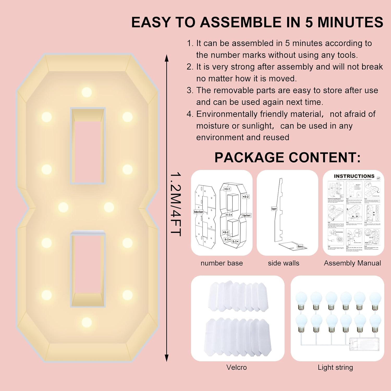 - Quick and Easy, No Tools Required: You can easily assemble marquee numbers 4 feet tall! Made of Corrugated plastic board, it is waterproof and sturdy in structure. Just align the same number parts, and the installation can be easily and quickly completed without any tools, ensuring that you can easily prepare for your party.