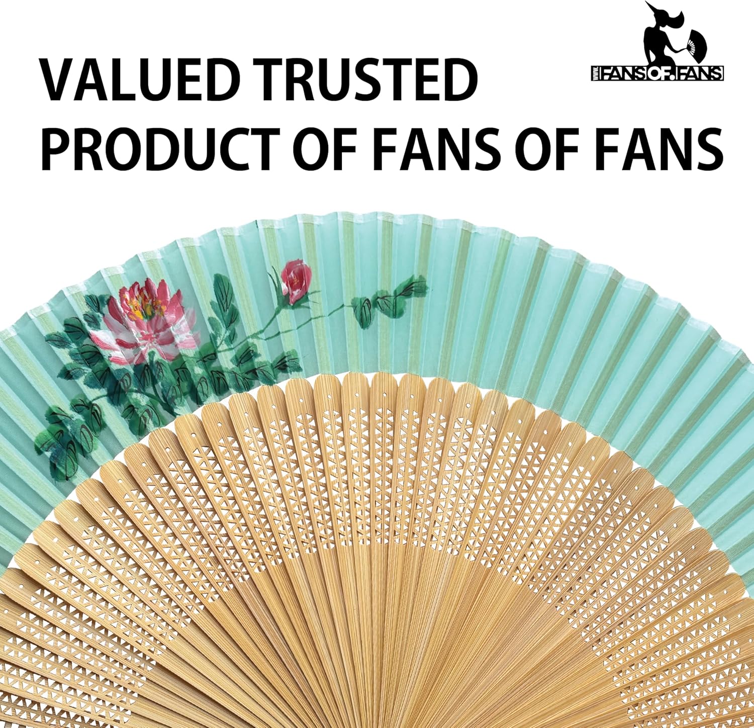 FANSOF.FANS Premium Floral Silk Fabric Border Handheld Folding Fan with Grade A Bamboo Ribs for Women Girls Event Birthday Wedding Favour with Tassel (Single Flower Border - Turqoise)