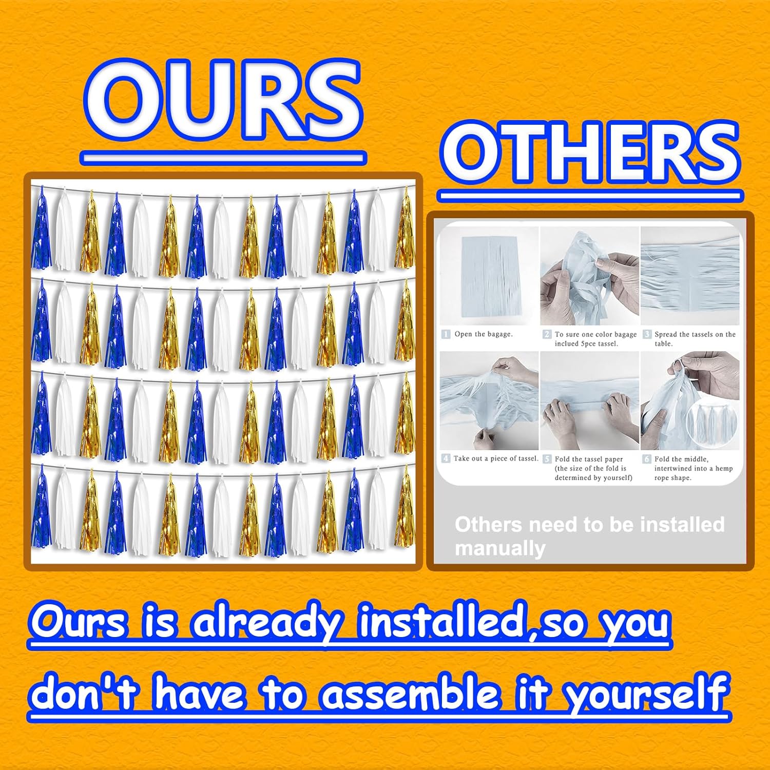 - 【Package Includes】The total length of the navy blue white gold birthday tassels banner is 40 feet, divided into 4 strips, each 10 feet long. Each banner contains 15 tassels, and each tassel measures 14 inches, for birthday decorations many occasions uitable for Patriotic display, Homecoming Float, Christmas Float, ecorative metal trailers, graduation floats etc
