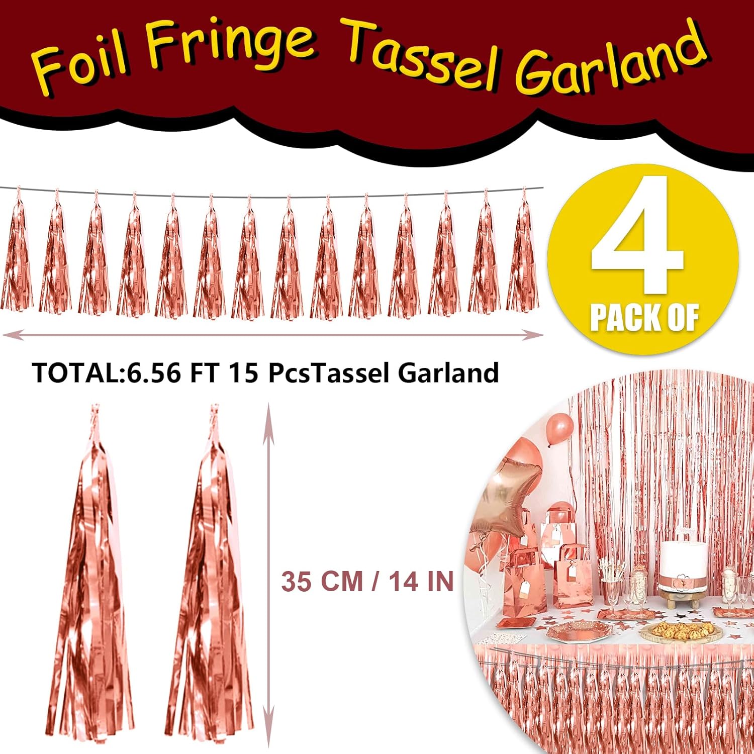 4P Rose Gold Foil Fringe Tassel Banner Garland Metallic Tinsel Streamers Wall Hanging Curtain Backdrop Banner for Parade Floats, 2024 Graduation Decorations, Wedding Party Decoration