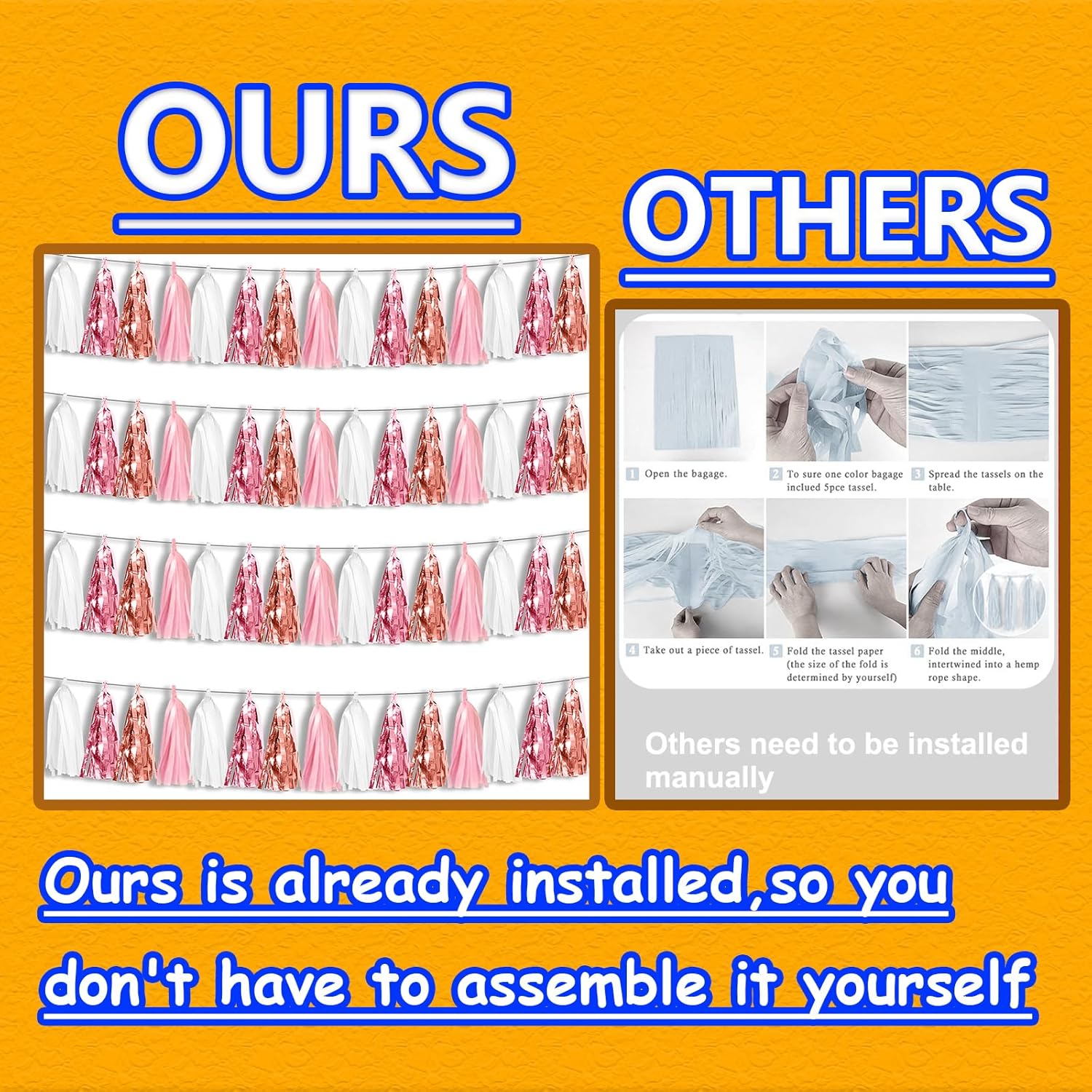 - 【Premium Reusable Tassel Material】: Our glitter fringe garland is made of high-quality PET material, with the virtue of nice craftsmanship and light weight which is safe and recyclable. And the smooth touch makes tassels easy to tidy up. They come with white ribbon for hanging, and garland tassels hang perpendicular to the string, and are adjustable to provide you with the option of spreading the tassels out or piecing them closer together.