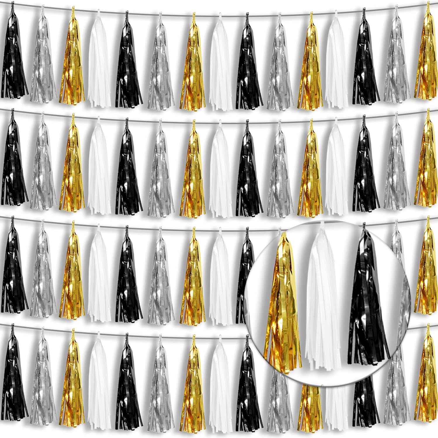 - 【Package Includes】The total length of the black gold silver birthday tassels banner is 40 feet, divided into 4 strips, each 10 feet long. Each banner contains 15 tassels, and each tassel measures 14 inches, for birthday decorations many occasions uitable for Patriotic display, Homecoming Float, Christmas Float, ecorative metal trailers, graduation floats etc