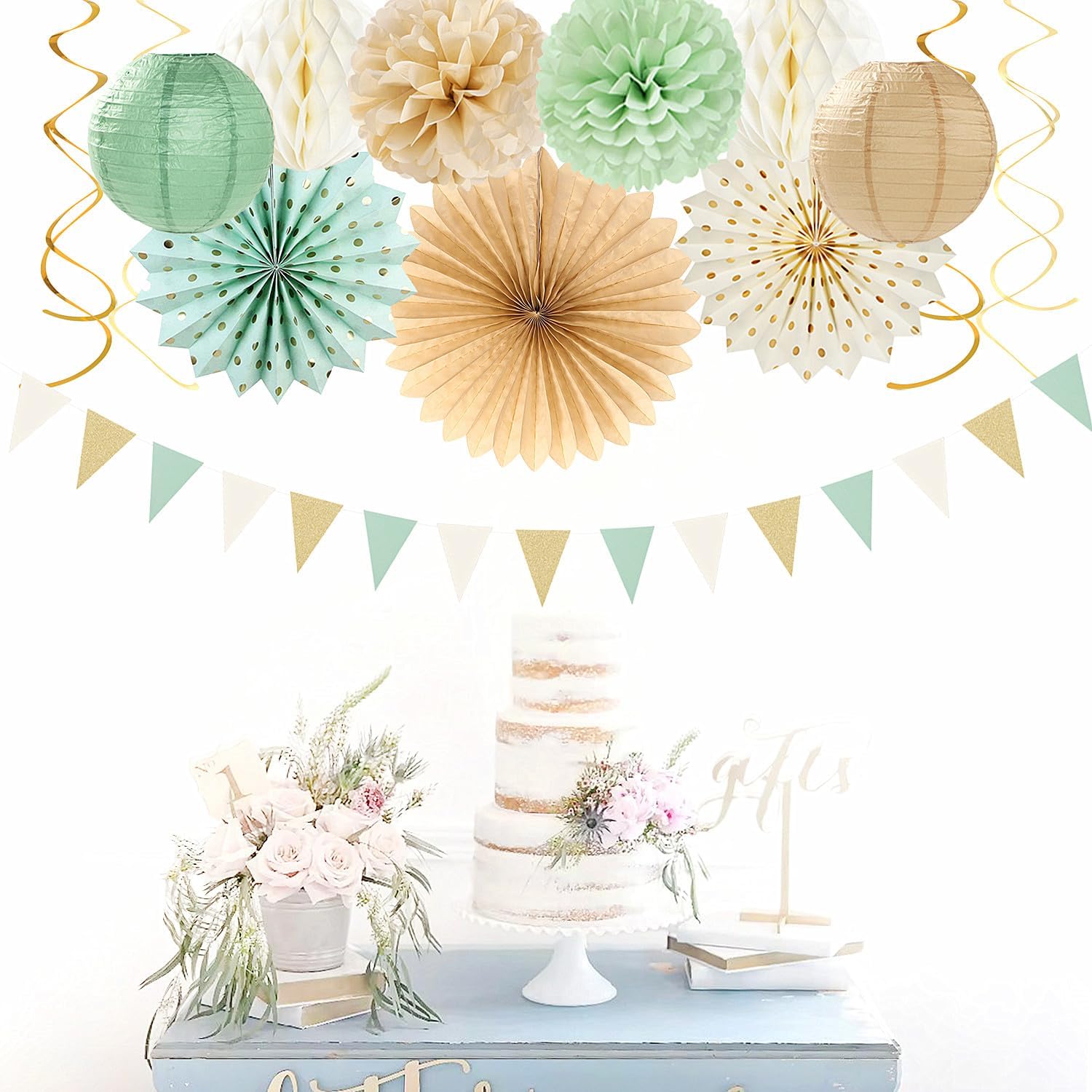- 1[Package Includes] Sage-olive green champagne gold party decorations kit contains: 1 x triangle bunting, 4 x paper fans, 9 x tissue pom poms, 2 x honeycomb balls, 4 x paper lanterns, a total of 20 pieces of various sizes and colors of decorations. Better embellish your party.