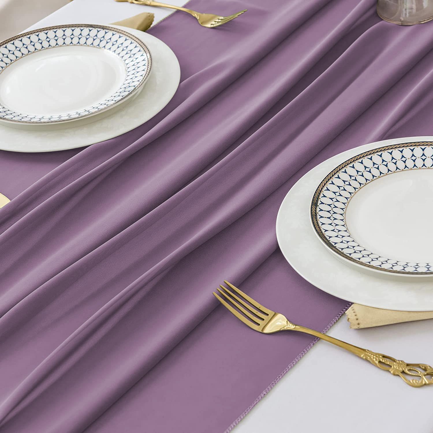 - 【Package Included】2 pcs Lavender chiffon table runner (27" x 120"/10ft). The design is elegant and beautiful, and the workmanship is exquisite. The table runner has a rustic and elegant look that pairs well with bohemian, farmhouse, chic, or other modern themes.