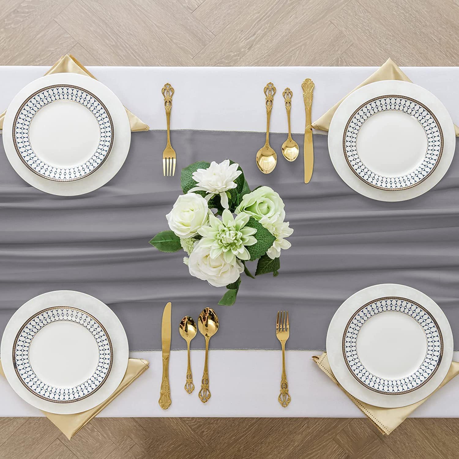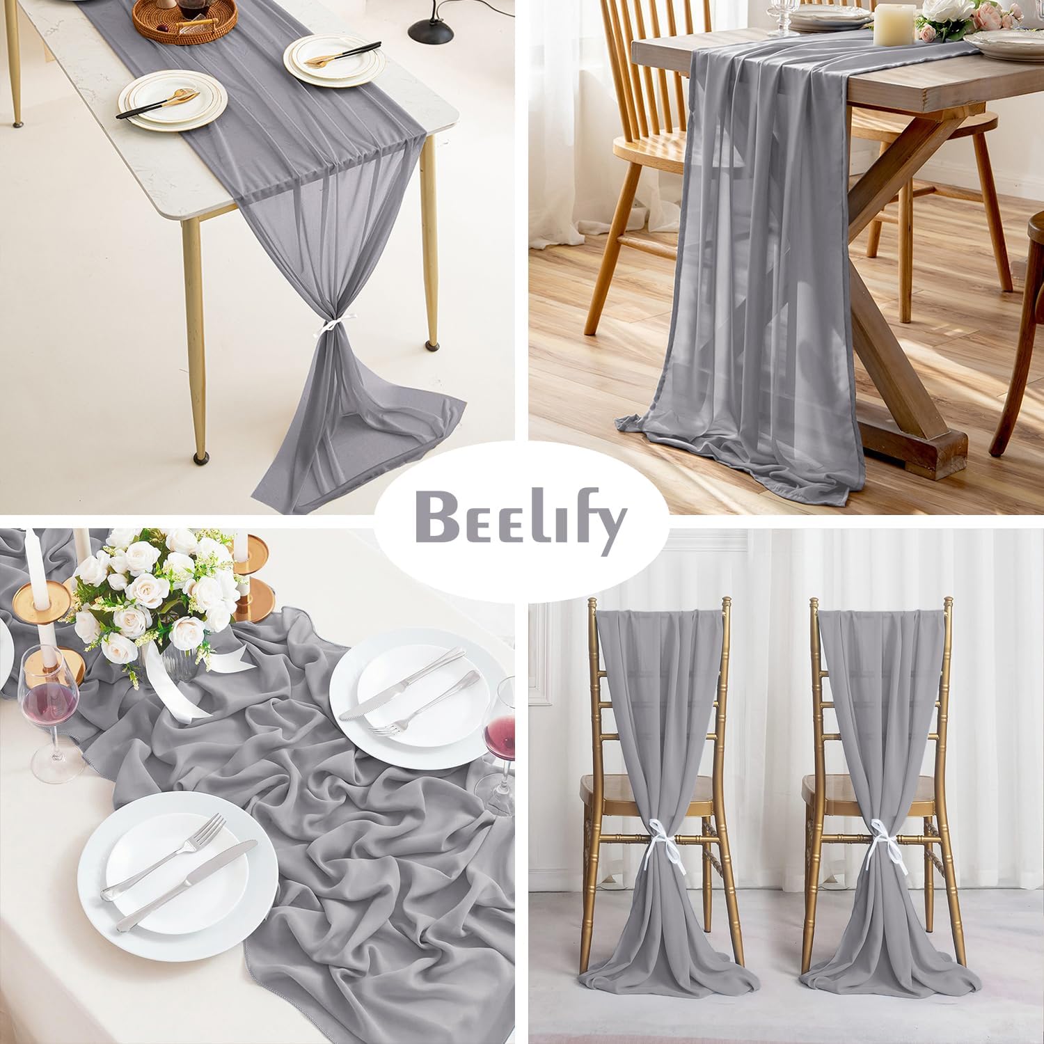 - 【Package Included】2 pcs Grey chiffon table runner (27" x 120"/10ft). The design is elegant and beautiful, and the workmanship is exquisite. The table runner has a rustic and elegant look that pairs well with bohemian, farmhouse, chic, or other modern themes.