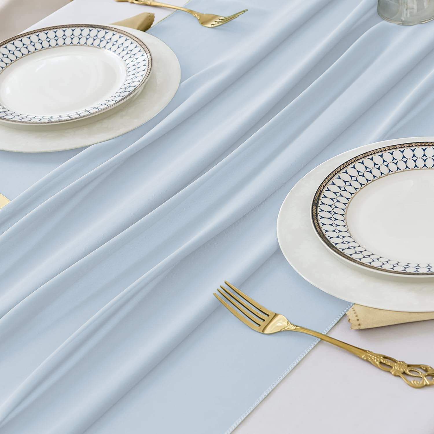 - 【Package Included】2 pcs Baby Blue chiffon table runner (27" x 120"/10ft). The design is elegant and beautiful, and the workmanship is exquisite. The table runner has a rustic and elegant look that pairs well with bohemian, farmhouse, chic, or other modern themes.