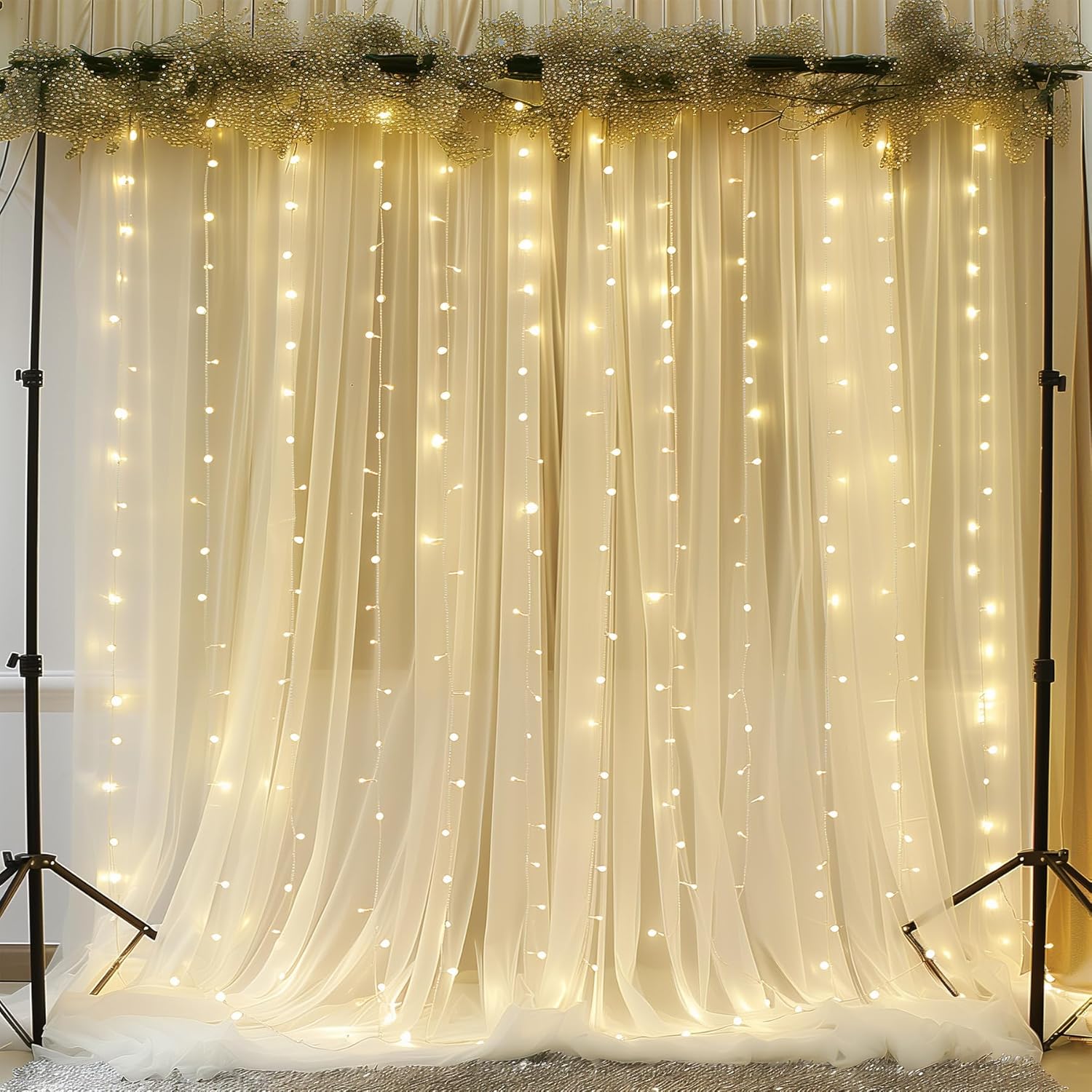 - Features: Beige fabric backdrop with lights included for a classy yet enchanting atmosphere, can be worked with your wedding backdrop or party backdrop, but also for ceremonies, festivals, anniversaries,or home decoration. INSTALLATION TIPS: firstly, untie and secure the main strand. and then, untie each string light.